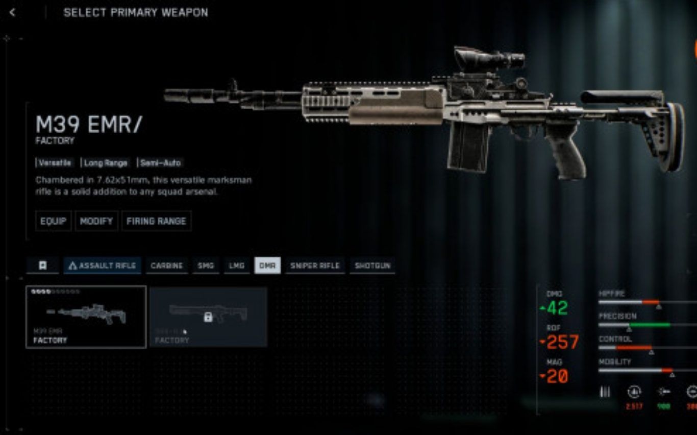 - M39 EMR — غرفة 7.62x51mm، هذه البندقية القناصة متعددة الاستخدامات تُعد إضافة صلبة إلى ترسانة أي فريق. تجمع بين دقة معقولة وضرر موثوق به في المدى المتوسط، ما يجعلها خيارًا ممتازًا للاعبين الذين يحتاجون إلى ضربة قوية مع قابلية على التعامل مع أهداف متحركة.