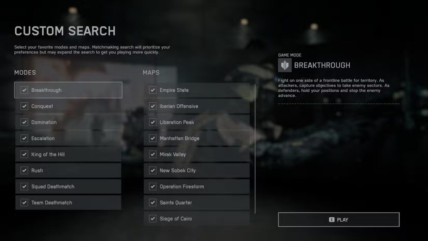 يمكنك أيضًا إنشاء بحث مخصص في وضع اللعب الجماعي (Custom Multiplayer Search) وإلغاء تحديد المربعات بجانب الخرائط أو الأنماط التي لا ترغب في لعبها، لتُركّز فقط على الخرائط الصغيرة والمعارك السريعة التي تساعدك على إكمال التحديات بكفاءة.