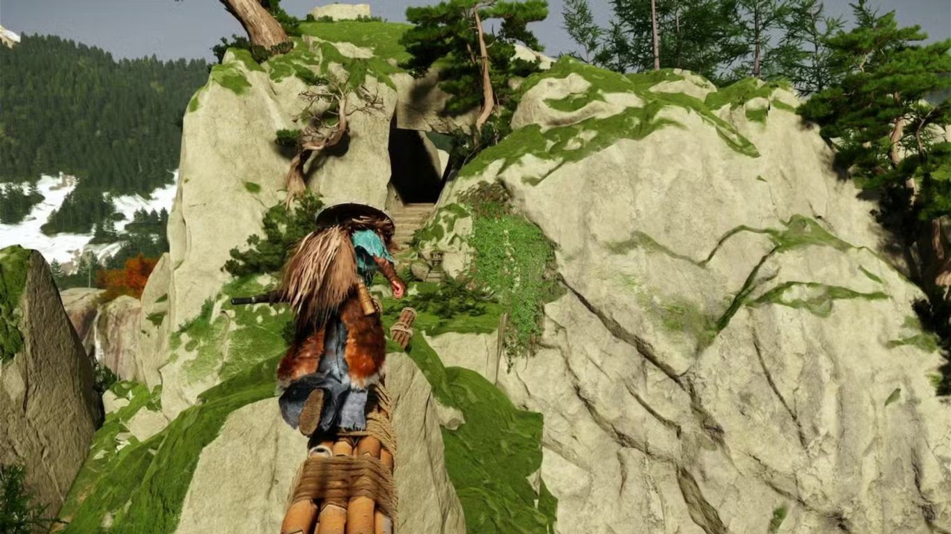 في نهاية الجسر، انظر للأعلى وسترى كومة من أعواد الخيزران المعلقة تشكّل ما يشبه السلم الطبيعي اقفز نحوها في اللحظة المناسبة، ثم استخدم زر R2 لتثبيت الخطاف إذا لزم الأمر، وابدأ في التسلق ببطء إلى الأعلى باستخدام العصا اليسرى (L) ستلاحظ أثناء الصعود أن الكومة تهتز قليلًا بفعل الرياح لكن تمسكك بالحبال سيبقيك ثابتًا استمر حتى تصل إلى المنصة الخشبية في الأعلى التي تمثل المدخل إلى الجزء النهائي من المزار.