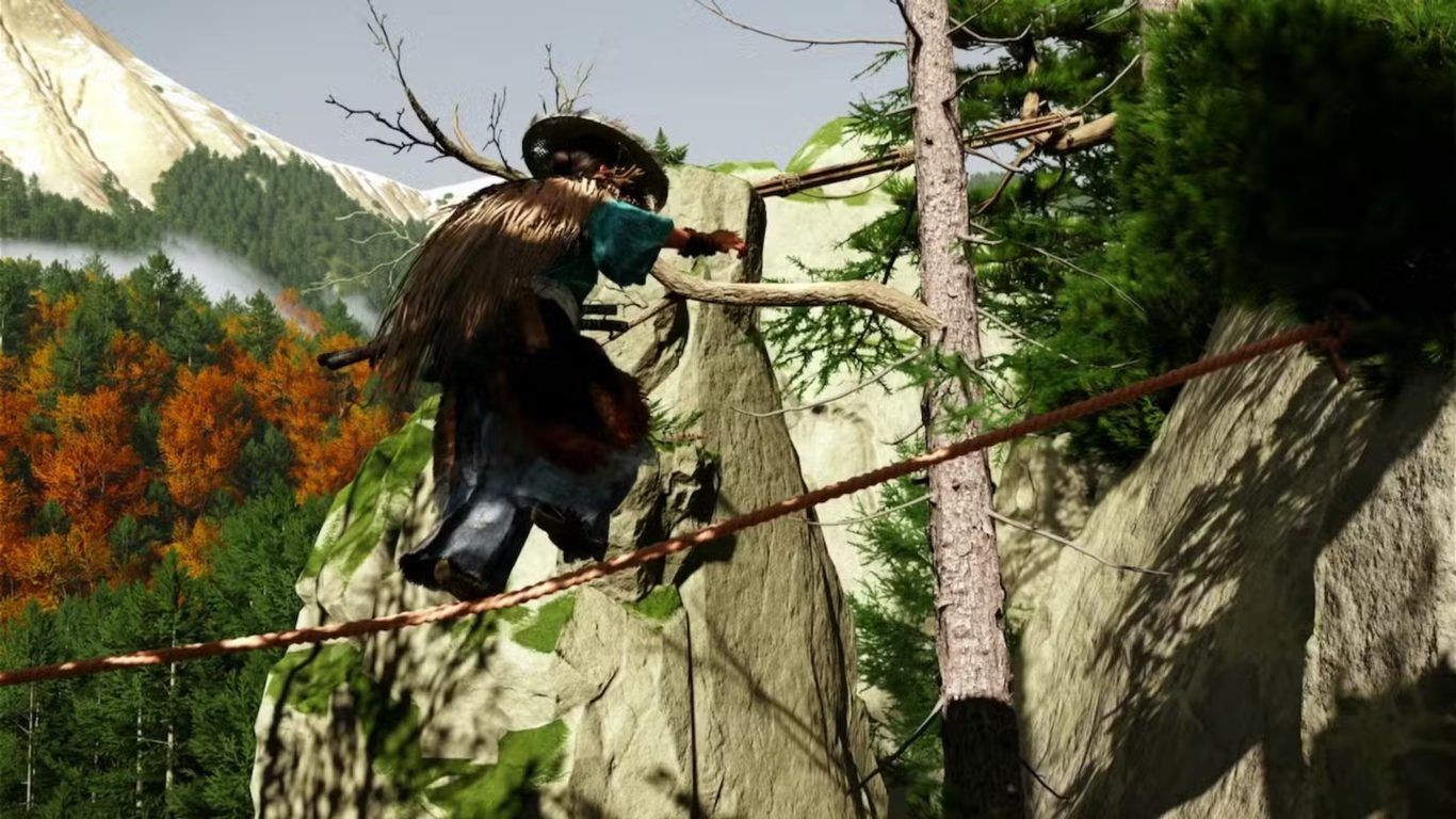 بعد هبوطك على المنصة الحجرية، تقدّم قليلًا وستلاحظ جسرًا من الخيزران يربط بين طرفي الجبل استخدمه للعبور إلى الجهة الأخرى لكن كن حذرًا الجسر مكوَّن من أعواد خيزران معلقة بحبال قديمة تتأرجح مع الرياح وكل خطوة عليه تُصدر صوت صرير خفيف مما يزيد من توتر اللحظة استخدم العصا اليسرى (L) للموازنة أثناء المشي ولا تتوقف طويلاً في المنتصف لأن وزن الشخصية قد يجعل الجسر يميل للأسفل تدريجيًا.