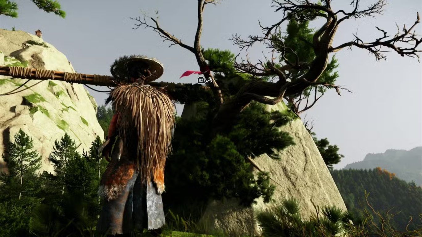 عند الوصول إلى حافة المنحدر أسفل الأعلام، ستلاحظ وجود حبال معلقة بين الأشجار تمتد إلى الجهة المقابلة من الجبل هذه هي النقطة التي تحتاج فيها إلى استخدام الخطاف (Grappling Hook) لتنفيذ سلسلة من التأرجحات الدقيقة قفز أولاً نحو الحبل واضغط R2 لتثبيت الخطاف، ثم استخدم الزخم للتأرجح نحو الحبل التالي عندما تقترب من نهايته اضغط R2 مرة أخرى لالتقاط الحبل الثاني، ثم كرر الحركة للمرة الثالثة لتصل أخيرًا إلى الحبل الأخير المربوط عند المنطقة العليا للمزار بعد التأرجح الثالث، استخدم زر القفز لتصعد فوق الحبل وتتوازن عليه.