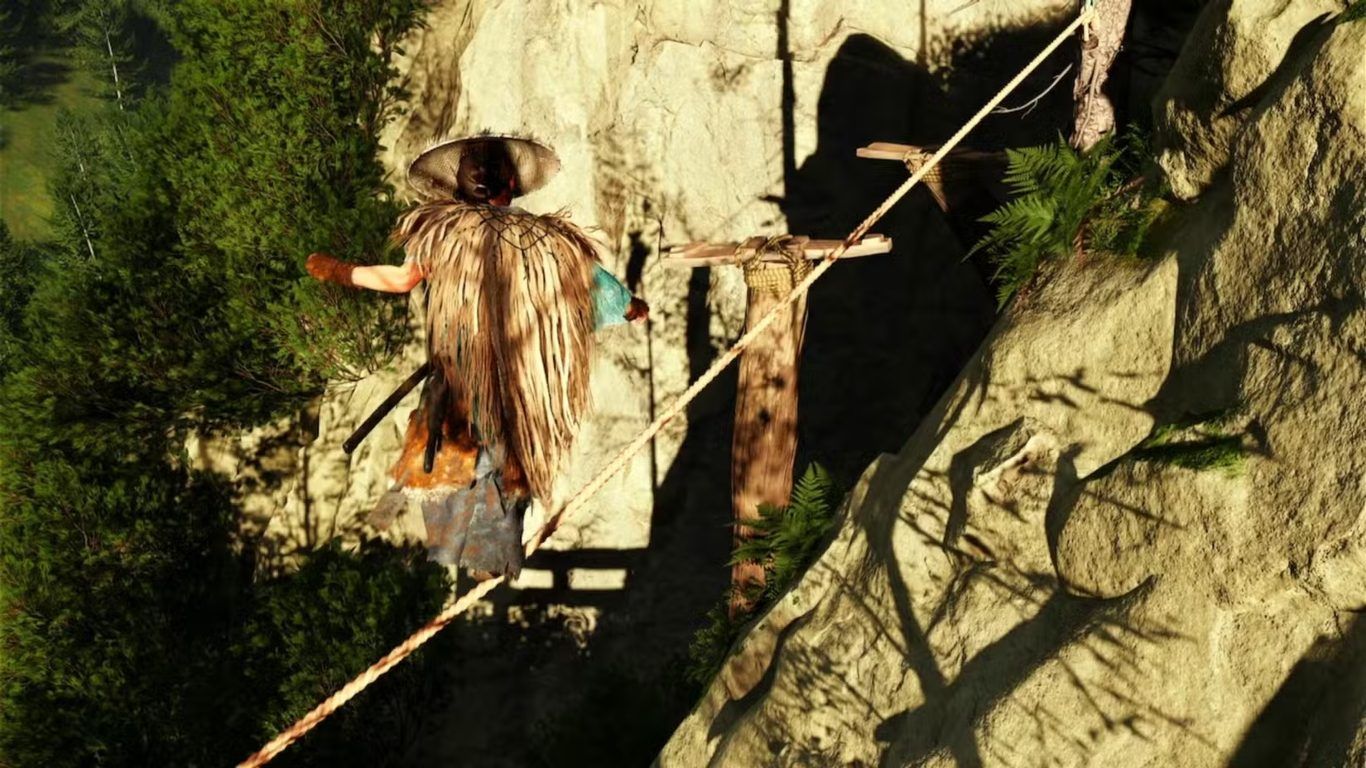 في نهاية الجسر ستلاحظ حبلا معلقا يمتد إلى الجهة المقابلة من الجبل تسلق ببطء نحو هذا الحبل باستخدام زر R2 لتثبيت الخطاف عليه ثم تابع السير فوقه حتى تصل إلى الجانب الآخر من الوادي حافظ على هدوئك أثناء المشي لأن الرياح القوية قد تحاول دفعك جانبا وعند اقترابك من الطرف الثاني استعد لتنفيذ قفزة دقيقة نحو الحبل التالي.