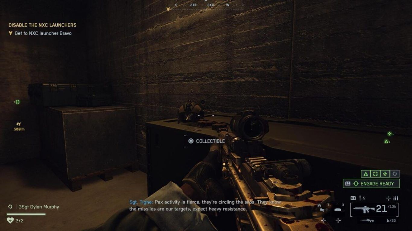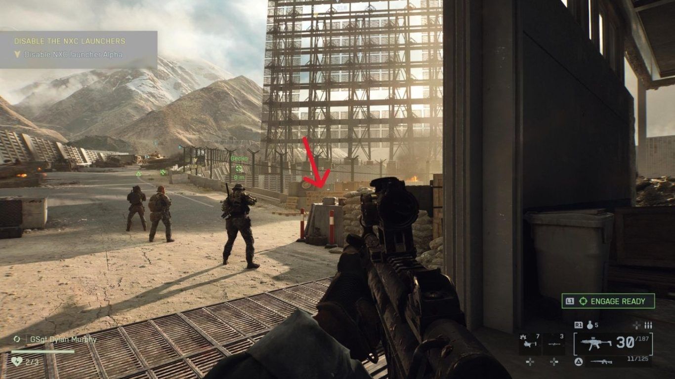 بعد التقدم في المهمة ووصولك إلى الجزء الذي يُطلب منك فيه تعطيل نظام NXC Alpha، ستجد نفسك تمر عبر سلسلة من المباني الثلاثة أثناء مرافقتك للقوات على الطريق. بعد خروجك من المبنى الثالث تحديدًا، اتجه نحو الجهة اليمنى من الباب الخلفي، وستلاحظ وجود أكياس رملية ومعدات ميدانية مبعثرة على حافة مرتفعة. فوق هذه الحافة مباشرةً ستجد اللوحة التعريفية الثانية موضوعة بجانب صندوق معدني صغير.