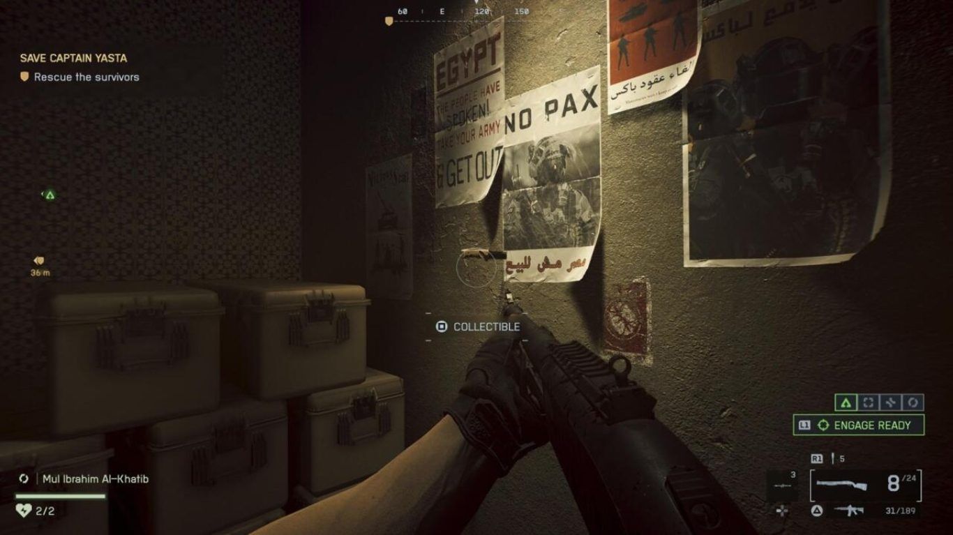 بعد جمعك للّوحة الأولى مباشرةً، تابع التقدم مع فرقتك نحو ساحة مفتوحة (Courtyard) حيث ستواجه المزيد من قوات Pax. بعد انتهاء الاشتباك القصير وتأمين المنطقة، اتجه نحو الغرف الجانبية على يسار الساحة. في إحدى هذه الغرف ستجد ملصقًا كبيرًا لمنظمة Pax مغروزًا فيه سكين عسكري، وتتدلّى منه اللوحة التعريفية الثانية. اقترب منها لتلتقطها، وبذلك تكون قد جمعت كامل المقتنيات الخاصة بمهمة Nile Guard.