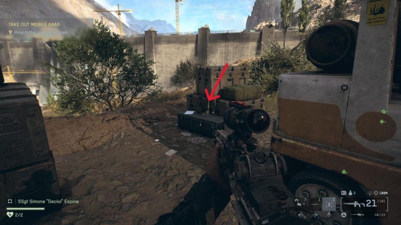 بعد أن تقوم بتدمير منظومة الدفاع الجوي Delta SAM وتستمع إلى الحوار القصير بين أعضاء الفرقة، ستستعيد السيطرة على الشخصية. عندها، اتجه صعودًا نحو التل على طول الطريق، وعلى الجانب الأيسر من الطريق ستلاحظ صندوقًا خشبيًا عسكريًا آخر موضوعًا بجانب بعض المعدات. فوق هذا الصندوق تمامًا توجد اللوحة التعريفية الرابعة والأخيرة لهذه المهمة.