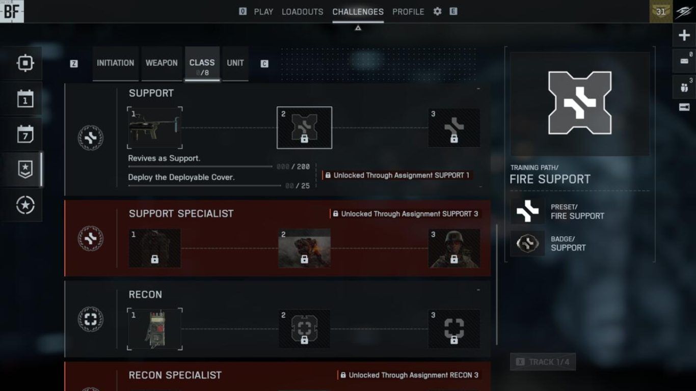 فئة Support مسؤولة عن الحفاظ على الفريق في حالة جيدة من خلال الإمداد بالعلاج والذخيرة، ومسار التدريب Fire Support Training Path يُحسن من قدرتها على دعم الفريق ومساندة زملائها بشكل مستمر. لفتح هذا المسار، اتبع التحديات التالية: