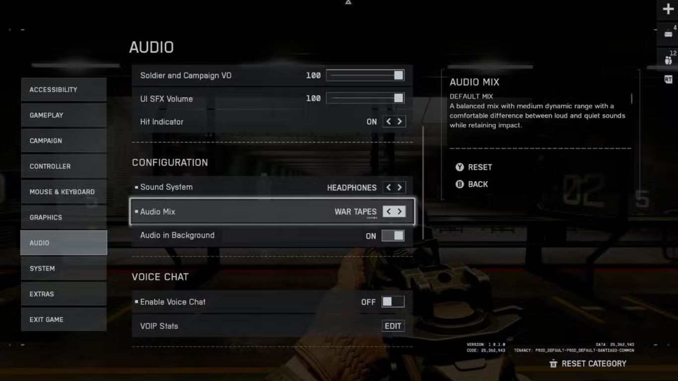 War Tapes | إعداد خام وعدواني يضيف تشويهًا متعمدًا ونطاقًا ديناميكيًا ضيقًا لإبراز التأثيرات الصوتية الكبرى مثل الانفجارات وإطلاق النار. | يُقدم تجربة قوية وغامرة تجعل اللاعب يشعر وكأنه في قلب ساحة المعركة صوت جهوري عميق وواقعي مثالي لطور القصة Single-Player Campaign ويعمل بشكل مذهل مع سماعات الرأس التي تدعم الصوت المحيطي ثلاثي الأبعاد 3D Spatial Audio. |