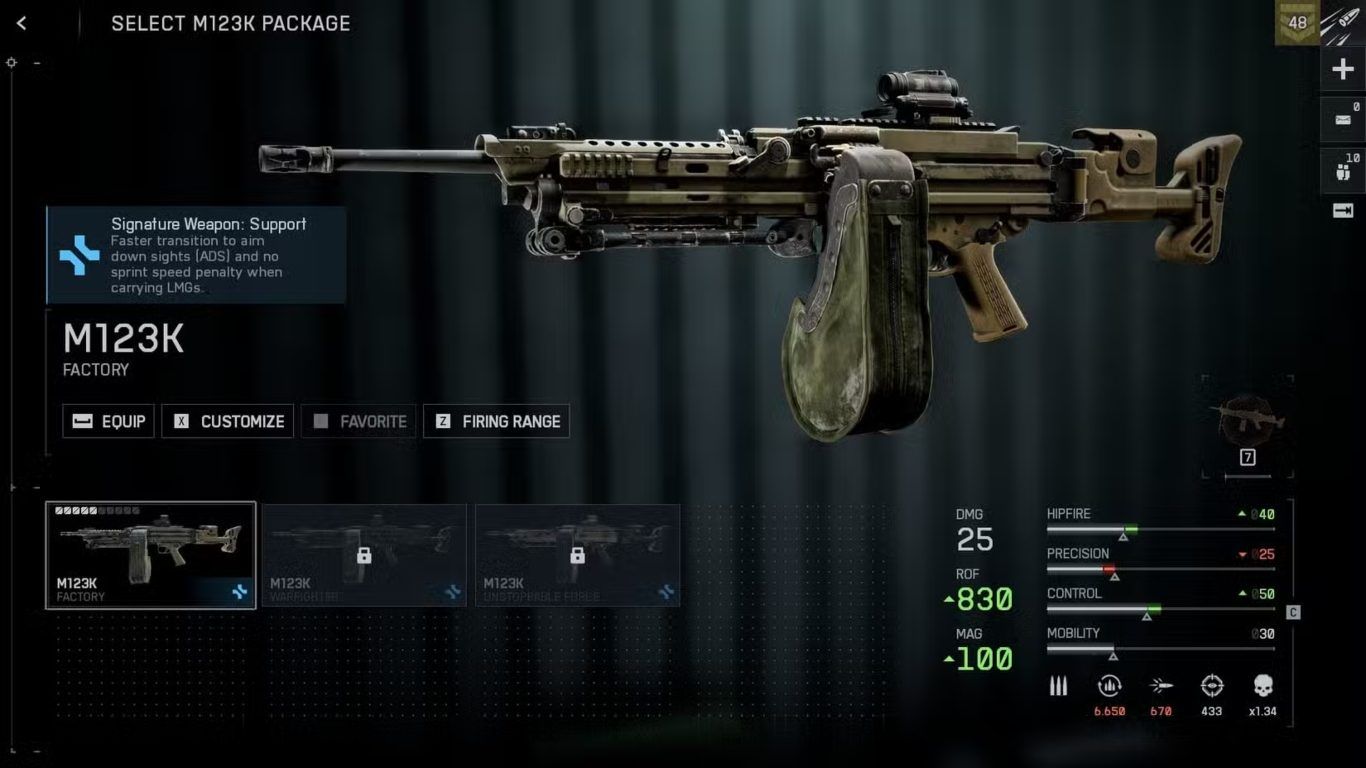 إن كنت من اللاعبين الذين يبحثون عن رشاش يفرغ كل ما في البرميل في وجه العدو دون توقف فإن M123K هو الخيار المثالي خصوصًا عند استخدامه مع فئة الدعم (Support Class) التي تمنح مكافآت في التحكم بالرشاشات الثقيلة وسرعة التعامل معها هذا السلاح صُمم حرفيًا لمن يحبون إغراق ساحة المعركة بالنيران المستمرة وإحداث الفوضى في صفوف الخصوم