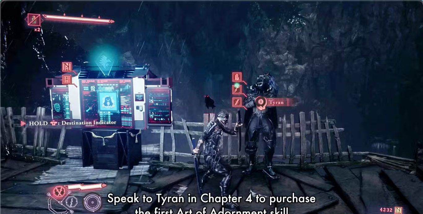 في المراحل الأولى من لعبة Ninja Gaiden 4 سيتعرف اللاعب على شخصية تُدعى Tyran وهو أحد الشخصيات المحورية التي ترافقك بشكل غير مباشر خلال مغامرتك إذ يظهر اسمه كلما وصلت إلى ما يُعرف باسم DarkNest Terminal وهي نقاط خاصة داخل اللعبة تعمل كأماكن للحفظ وإدارة الموارد تمامًا مثل المتاجر الصغيرة وفي كل مرة تصل فيها إلى أحد هذه النقاط ستجد أيضًا غراب Tyran الذي يمكنك من خلاله استدعاء تيريان إلى موقعك في أي وقت تحتاجه.