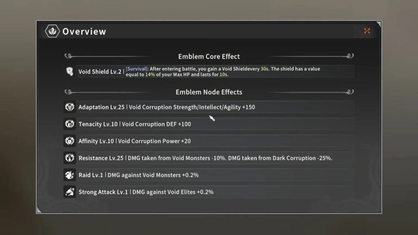 بمجرد أن تصل Emblem Nodes إلى المستوى 30، سيتم فتح أول تأثير خاص يُعرف باسم Emblem Core Effect، وهو المرحلة التي تبدأ فيها فعليًا تقوية نواة الشعار (Core) وجعلها أكثر فاعلية في مواجهة الأعداء المتأثرين بفساد الـ Void.