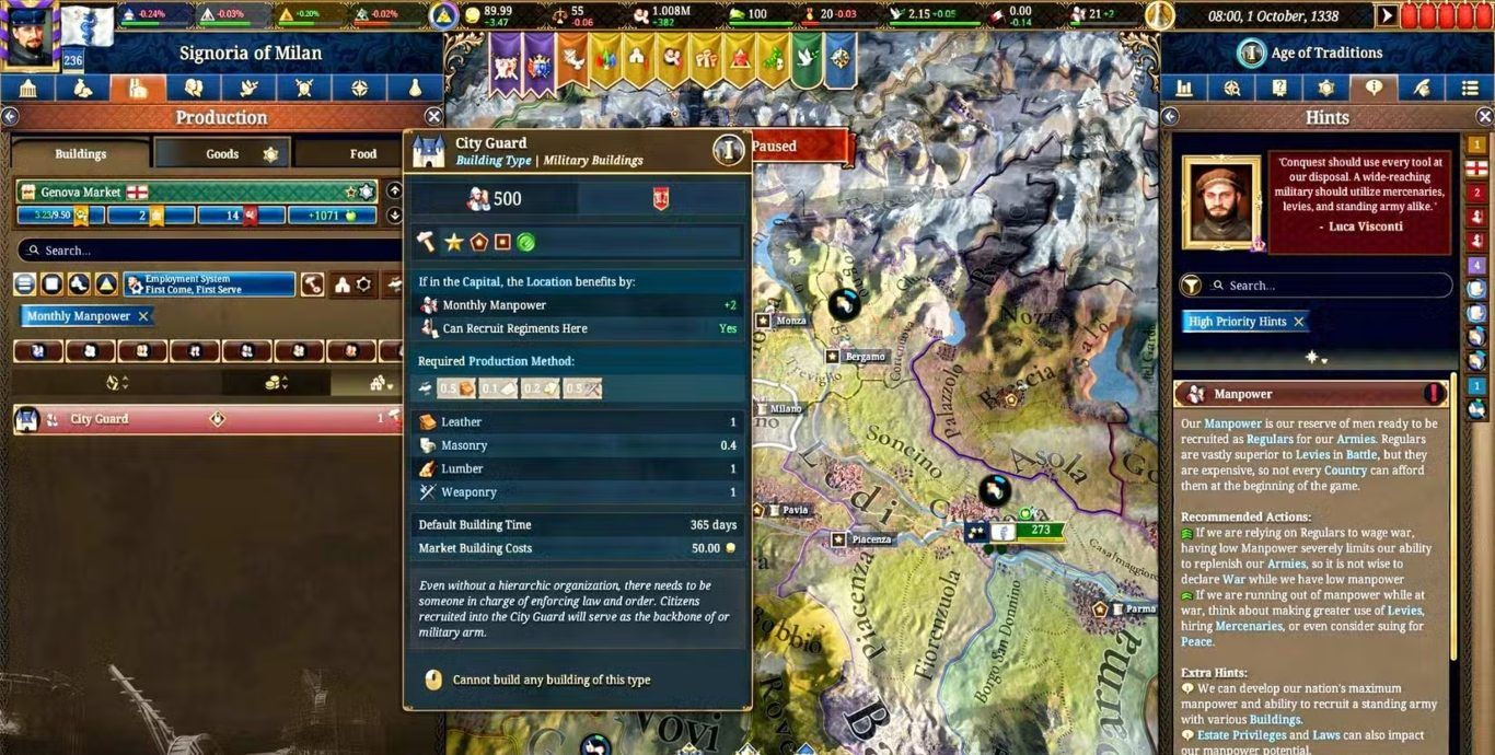 بمجرد تنفيذ أي من الطريقتين، ستظهر أمامك قائمة بالمباني المناسبة مثل City Guard وغيرها. على سبيل المثال، يمنحك مبنى City Guard زيادة بمقدار +2 Manpower شهريًا.