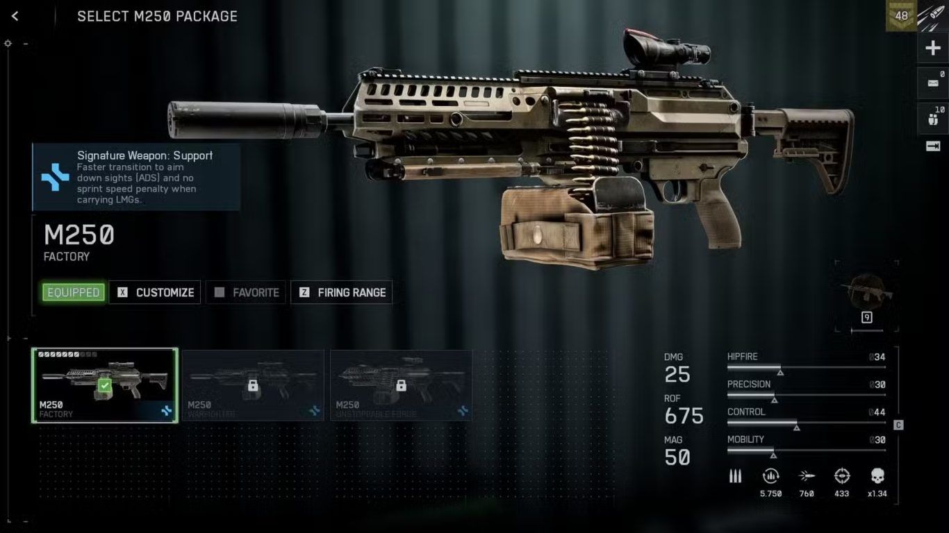 يُعد M250 مثاليًا للقتال في المساحات المفتوحة لخريطة Fort Lyndon، حيث تكثر الخطوط الطويلة للرؤية، ويمكنك من خلالها التحكم بالمعركة من مسافة آمنة. ورغم ذلك، فإن أداؤه في القتال القريب ليس سيئًا على الإطلاق، بفضل ارتداده المنخفض وسرعته المعتدلة في إطلاق النار.