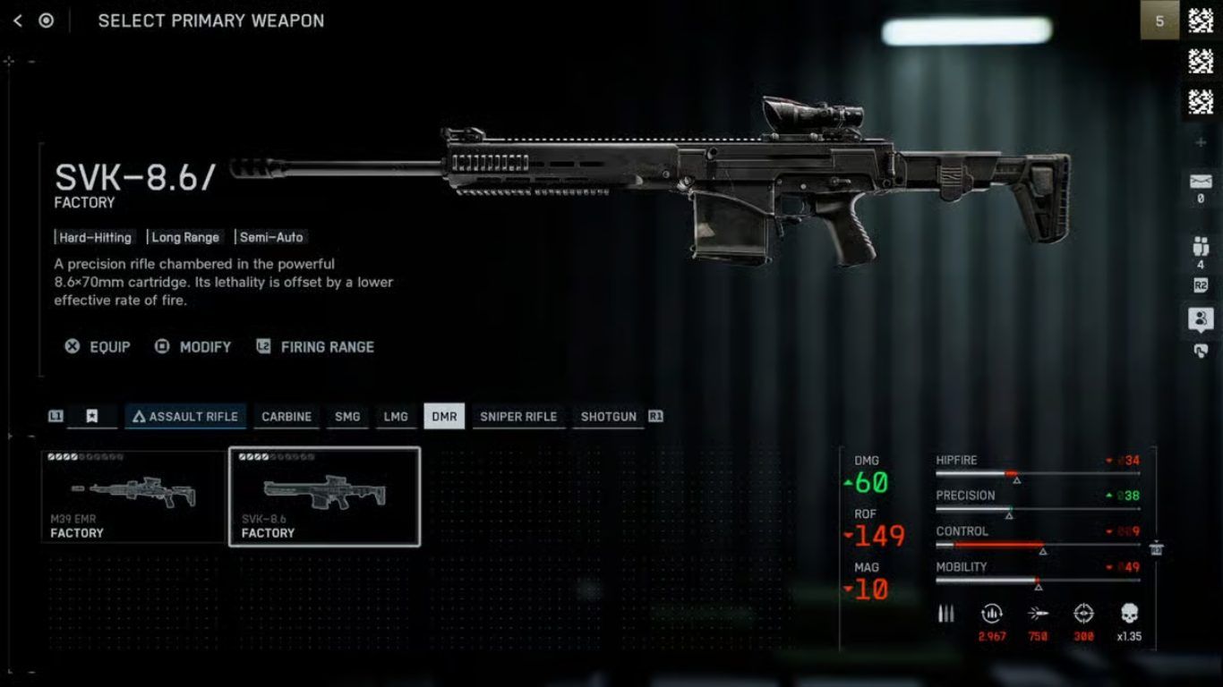 يُعتبر أفضل بندقية DMR في طور Gauntlet دون منازع، بفضل قوته العالية ودقته الممتازة. يتميز بقدرته على قتل اللاعبين المدرعين بثلاث طلقات فقط في الصدر، أو طلقتين في الرأس، مما يجعله سلاحًا قاتلًا في أيدي القناصين المهرة الذين يجيدون التصويب الدقيق. يجمع هذا السلاح بين معدل ضرر مرتفع وسرعة إطلاق معتدلة، مما يجعله مثاليًا للقتال متوسط إلى بعيد المدى. وهو الخيار الأمثل للاعبين الذين يفضلون الحفاظ على المسافة والسيطرة على المعركة من بعيد، دون الحاجة للدخول في اشتباكات مباشرة. - SVDM و M39:
