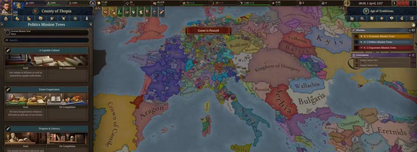 عند إتقان هذه الخطوات الأولى، ستحصل على مكافآتٍ قويةٍ في المراحل المبكرة من اللعبة، إلى جانب فهمٍ عمليٍ لكيفية زيادة السعة الإدارية (Administrative Capacity) وتعظيم الإمكانيات الاقتصادية والسكانية لمقاطعاتك الأساسية. تعتبر هذه المهمات بمثابة خطة تأسيسٍ استراتيجية تساعدك على بناء دولةٍ مستقرةٍ ومزدهرةٍ قبل أن تخوض أولى حروبك الكبرى.