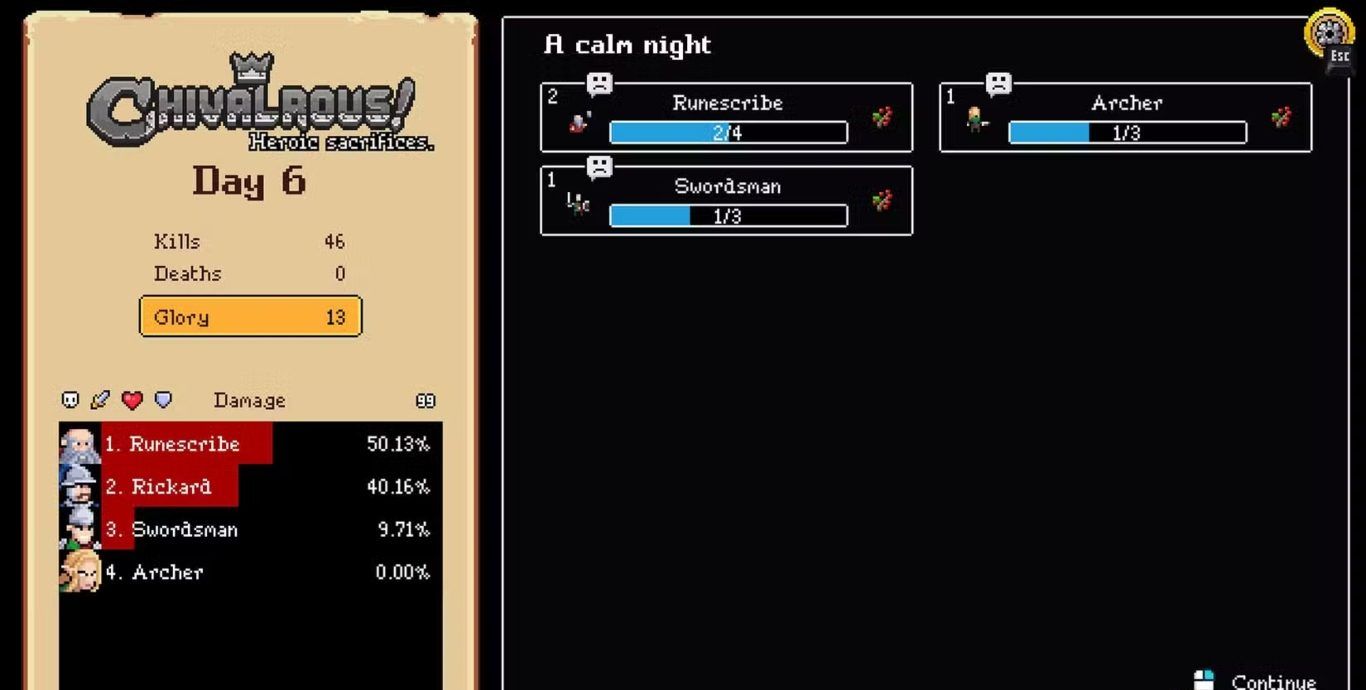 في نهاية كل يومٍ من القتال، وبعد أن تتمكن من صدّ هجمات الوحوش بنجاح، تتوجه وحداتك إلى الحانة (Tavern) للراحة واستعادة نشاطها. وهناك، يحصل كل جندي على قطعة طعامٍ واحدة (باستثناء بطلك الرئيسي Hero الذي لا يحتاج إلى الأكل). تناول الطعام لا يُبقيهم على قيد الحياة فحسب، بل يمنحهم أيضًا نقاط خبرة (Experience Points) تساعدهم على التقدم في المستوى وزيادة قوتهم في المعارك اللاحقة.