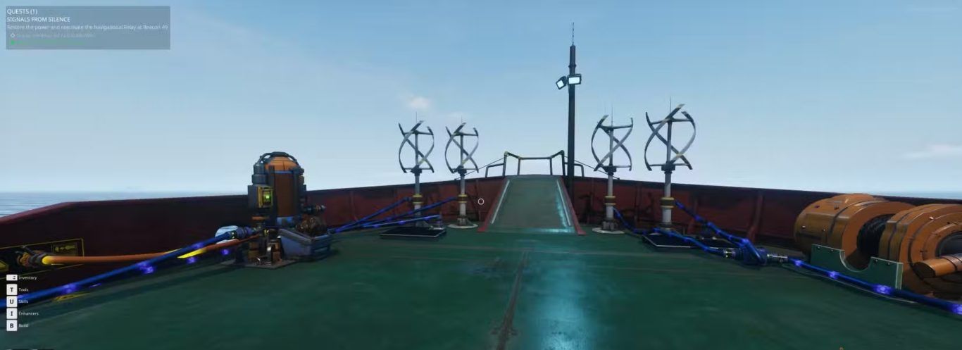 يوجد في مقدمة السفينة سطح واسع مثالي لتركيب الألواح الشمسية والعنفات الهوائية، ويمكنك توصيل هذه المولدات بالمنافذ القريبة الموجودة في هيكل السفينة. بمجرد تشغيل النظام بشكل صحيح وربط الكابلات، ستصبح سفينتك مكتفية ذاتيًا بالكامل من ناحية الطاقة، مما يعني أنك لن تضطر للقلق بشأن نفاد الكهرباء أو الاعتماد على مصادر خارجية محدودة.