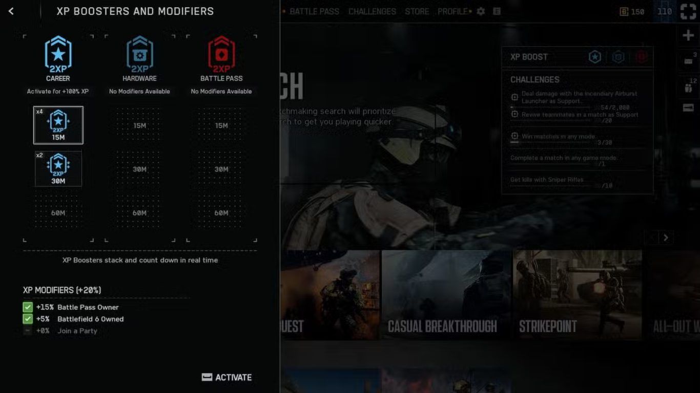 علاوة على ذلك، هناك ما يُعرف بـ معدّلات الخبرة XP Modifiers، وهي مزايا ثابتة تمنحك مكافآت إضافية دون الحاجة لاستخدام معززات قابلة للاستهلاك. فمجرد امتلاكك للعبة يمنحك زيادة دائمة بنسبة 5٪ في الخبرة، كما تحصل على 5٪ إضافية عند اللعب ضمن فريق، مما يشجع على اللعب التعاوني مع الأصدقاء لتحقيق أقصى استفادة ممكنة.