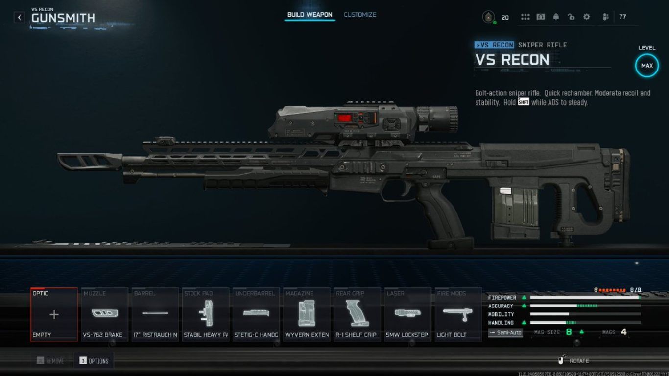 يعد سلاح VS Recon أفضل بندقية قنص متاحة في Black Ops 7 عند الإطلاق لأنه السلاح الوحيد العامل بنظام الإطلاق الفردي ويتميز بقدرة عالية على إسقاط الخصوم بضربة واحدة عند إصابة الرأس أو الجزء العلوي من الجذع كما يتميز بثبات جيد وسهولة في التعامل مما يجعله مناسبًا للاعبين الذين يعتمدون على الدقة والسرعة في المواجهات بعيدة المدى