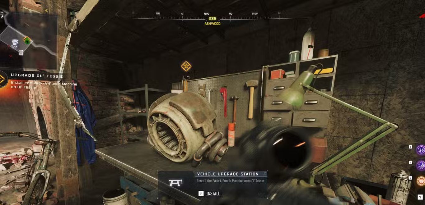 داخل الورشة يجد اللاعب محطة ترقية المركبات وهي محطة مخصصة لتركيب وحدة Pack a Punch على Ol Tessie ويتم ذلك من خلال التفاعل مع المحطة لتركيب الوحدة مباشرة على المركبة وتعد هذه الخطوة جزءًا أساسيًا من نظام الترقية في الخريطة لأن Ol Tessie ستحتاج إلى محطة الترقية نفسها للحصول على ترقيات أخرى مستقبلًا مما يجعل هذه الورشة نقطة رئيسية يجب العودة إليها مرارًا خلال الجولات المتقدمة.