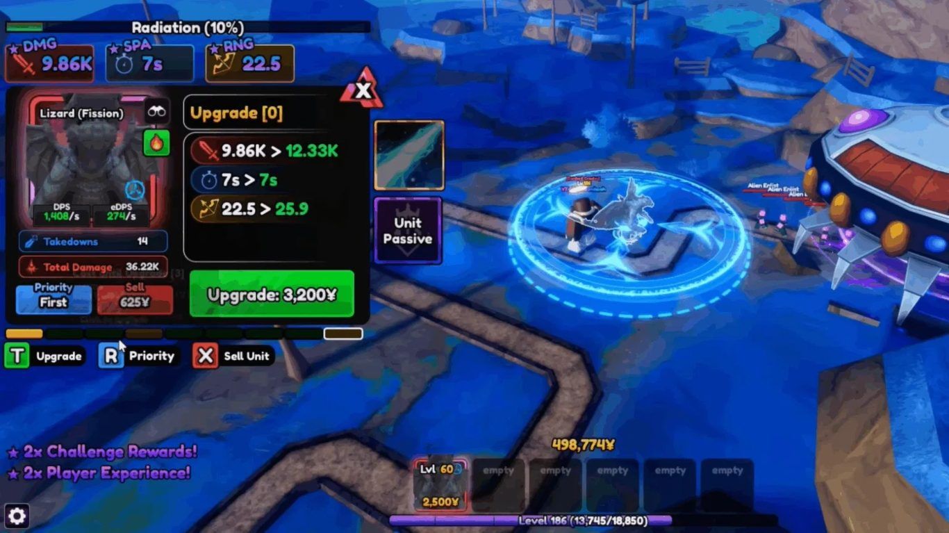 واحدة من أهم سماته الفريدة هي وجود عداد إشعاعي (Radiation Meter)، والذي يمثل جوهر قوته الحقيقية. كلما استمر Lizard في القتال، يمتلئ هذا العداد تدريجيًا، وعند امتلائه بالكامل، يصبح قادرًا على إطلاق هجوم نووي فائق القوة (OP Nuke Attack)، وهو انفجار مدمر قادر على محو مجموعات ضخمة من الأعداء بضربة واحدة. هذا الهجوم يجسد لقب Lizard كـ”ملك الوحوش”، ويمنحه تفوقًا واضحًا على باقي الوحدات في الميتا.