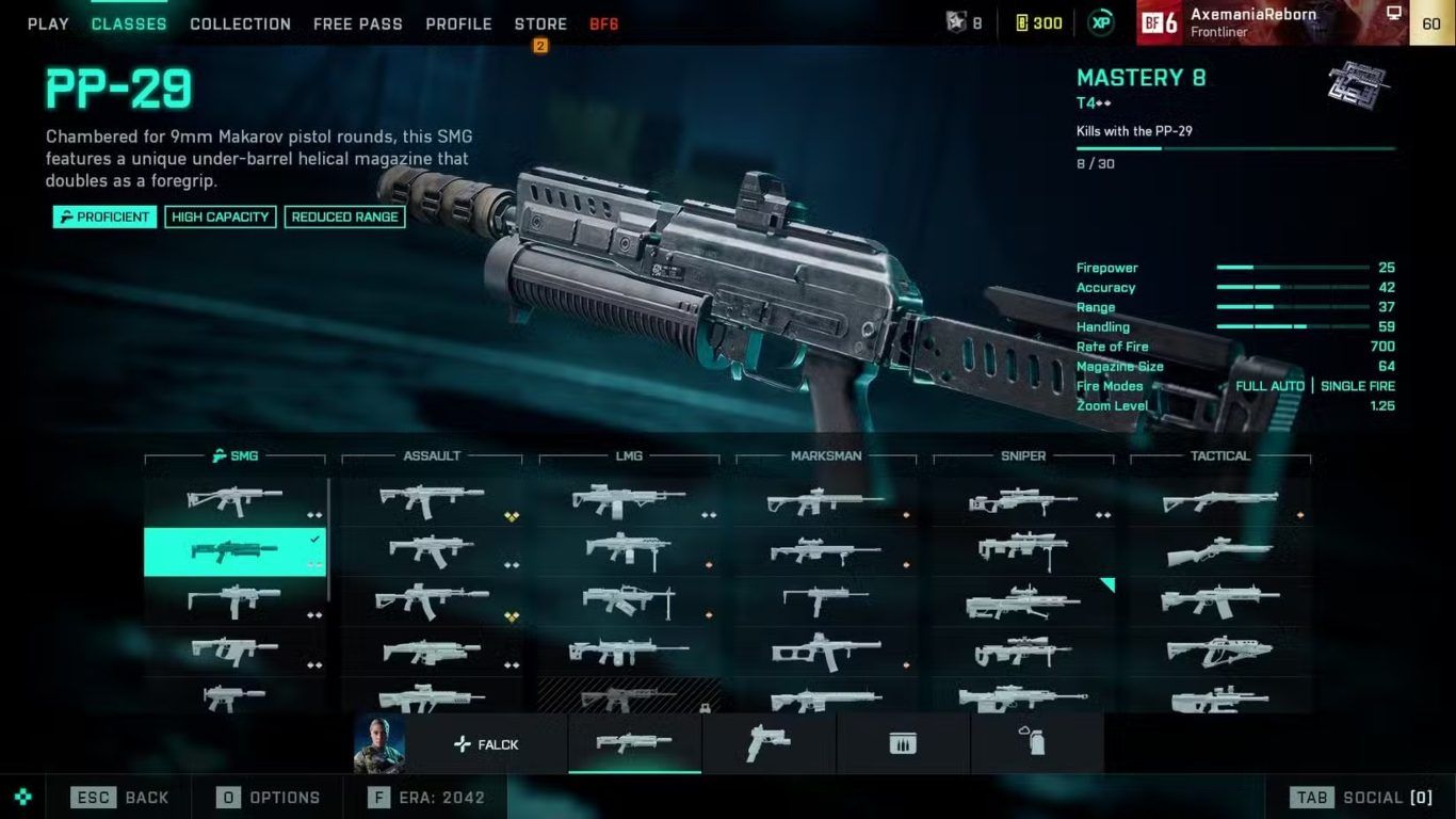 يحافظ هذا السلاح على معظم ضرره حتى مسافة 39 مترًا، ومع ملحق High-Power Mag، يمكنه منافسة البنادق الهجومية حتى مسافة 99 مترًا، ولهذا يُعد من أفضل الأسلحة المناسبة للمبتدئين في BF2042. فقط تذكّر أن سعة الذخيرة القصوى تتغيّر عندما تبدّل بين أنواع المخازن والطلقات.
