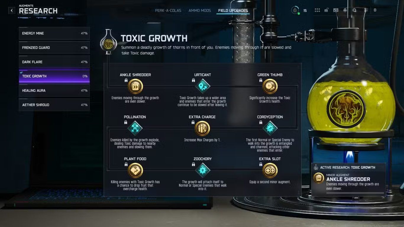 أما بالنسبة لـ Minor Augment، فيُعتبر Ankle Shredder الخيار الأفضل لتعزيز الأسلوب الدفاعي للاعب. إذ يعمل هذا التعديل الصغير على إبطاء حركة الأعداء بدرجة أكبر أثناء مرورهم عبر Toxic Growth، مما يمنح اللاعب وقتًا أطول لاستعادة وضعه، وإعادة تعبئة الذخيرة، والتراجع عند الضرورة دون القلق من الاندفاع المفاجئ للزومبي. هذا التعديل يكمل دور Urticant بشكل مثالي، إذ يجمع بين توسيع منطقة التأثير وإبطاء الخصوم بشكل إضافي.