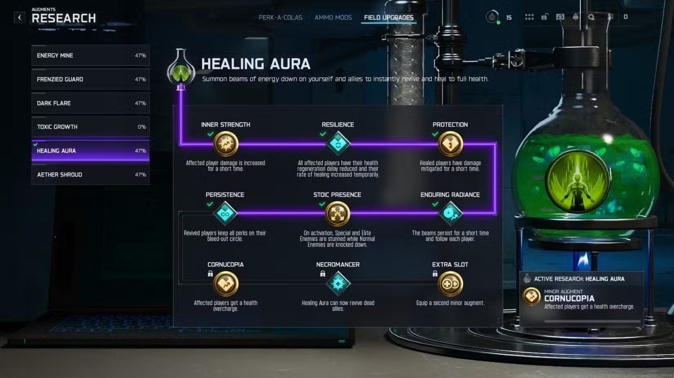 وبناءً على ذلك فإن أفضل Major Augment يمكن استخدامه مع Healing Aura هو Necromancer إذ يعمل هذا التعديل على منح القدرة ميزة بالغة الأهمية تتمثل في إحياء الحلفاء الميتين فور إصابتهم بهالة Healing Aura مما يجعلها عنصرًا منقذًا للحياة في المواقف الصعبة داخل خريطة Ashes of the Damned التي تمتاز بمساحاتها الشاسعة وتعدد مساراتها. في كثير من الأحيان قد يكون اللاعب بعيدًا عن زملائه ولا يمتلك الموارد الكافية أو الوقت الكافي للوصول إليهم لإحيائهم يدويًا ولذلك فإن وجود Necromancer يجعل Healing Aura وسيلة فعالة لتقليل الخسائر وإنقاذ الموقف عند بعد المسافات أو شدة الهجوم. إضافة إلى ذلك فإن هذا التعديل يوفر طبقة أمان إضافية في الجولات المتقدمة عندما يصبح الزومبي أكثر شراسة وسرعة وتزداد احتمالية سقوط أعضاء الفريق.