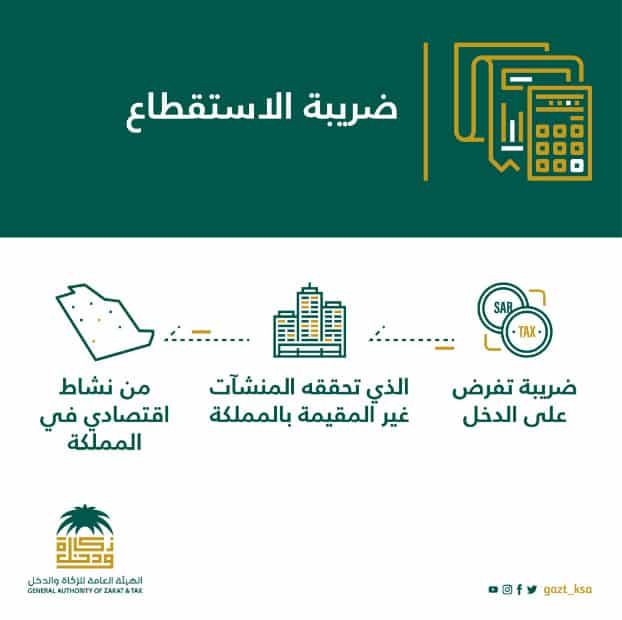 وتُفرض ضريبة الاستقطاع على كافة المبالغ المدفوعة من مصدر في المملكة للجهات غير المقيمة التي ليس لديها منشأة دائمة في المملكة، وذلك وفقًا للأسعار المحددة في المادة الثامنة والستين من نظام ضريبة الدخل، والمادة الثالثة والستين من لائحته التنفيذية.