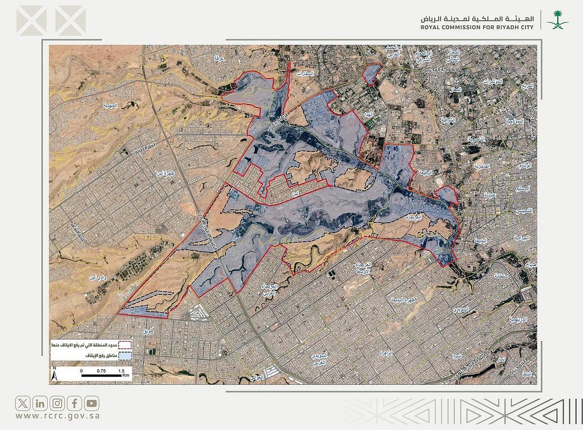 أعلنت الهيئة الملكية لمدينة الرياض، رفع الإيقاف عن أراضٍ واقعة في غرب مدينة الرياض، بمساحة إجمالية تبلغ 33.24كم² بما يشمل تمكين ملاك الأراضي والعقارات من التصرف بالبيع والشراء وأعمال التخطيط والتقسيم والتجزئة وإصدار رخص البناء، على أن يُطبق الكود العمراني لمنطقة وادي حنيفة وروافده في المنطقة التي رُفع الإيقاف عنها.