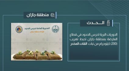 أحبطت الدوريات البرية لحرس الحدود في قطاع الدائر بمنطقة جازان تهريب (72200) قرص خاضع لتنظيم التداول الطبي، وجرى استكمال الإجراءات النظامية الأولية، وتسليم المضبوطات لجهة الاختصاص.