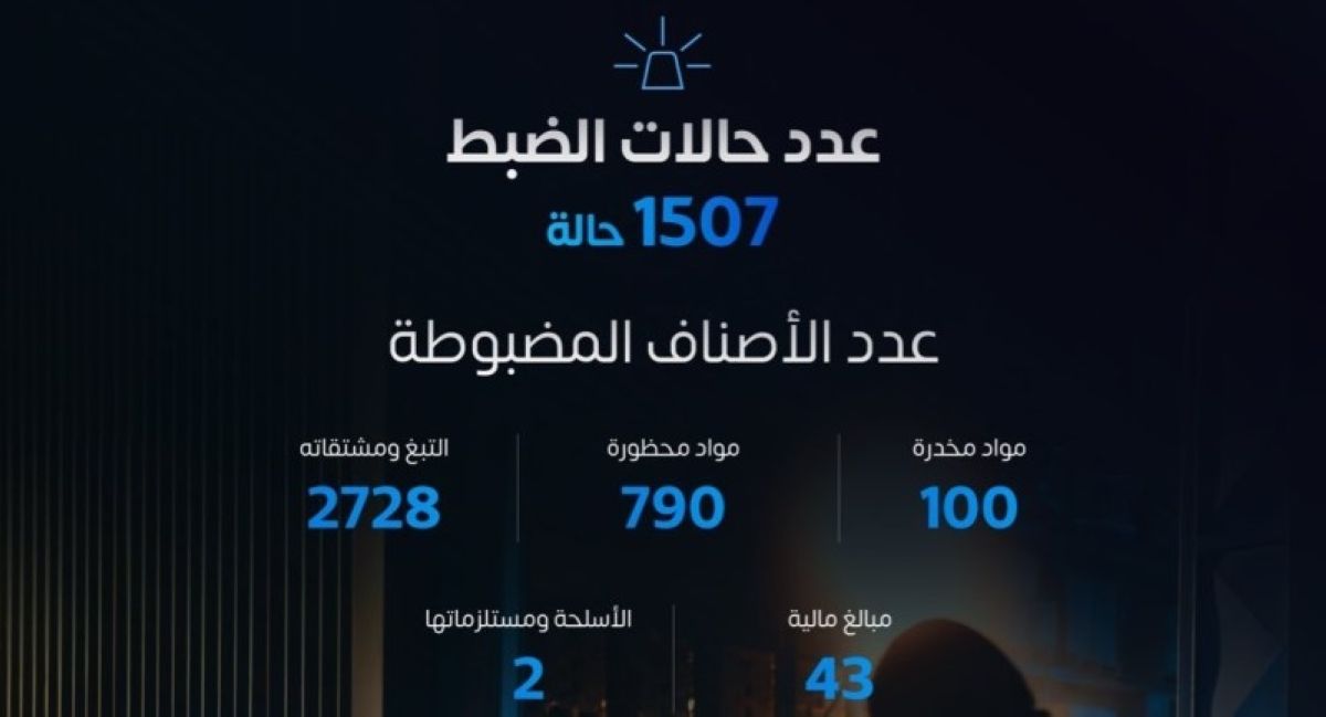 تمكنت هيئة الزكاة والضريبة والجمارك خلال أسبوع من ضبط 1507 حالات تهريب شملت عددًا من الأصناف الممنوعة والمخالفة، من أبرزها 2728 صنفًا من التبغ ومشتقاته، و790 مادة محظورة، و100 مادة مخدرة، إضافة إلى 43 مبلغًا ماليًا، كما تم ضبط حالتين لأسلحة ومستلزماتها.