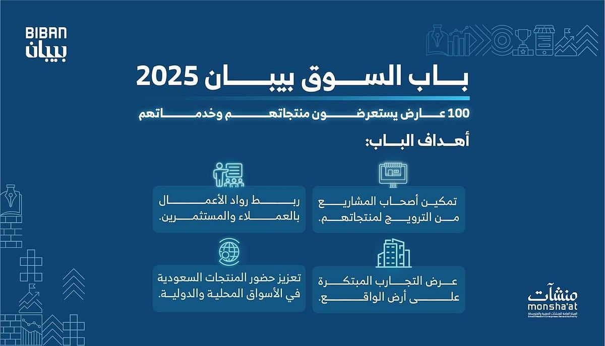 يحتضن ملتقى "بيبان 2025"، الذي تنظمه الهيئة العامة للمنشآت الصغيرة والمتوسطة "منشآت" خلال الفترة من 5 إلى 8 نوفمبر المقبل في مركز واجهة الرياض للمعارض والمؤتمرات، تحت شعار "وجهة عالمية للفرص"، أكثر من (100) عارض من رواد الأعمال وأصحاب المنشآت الصغيرة والمتوسطة من داخل المملكة وخارجها ضمن " باب السوق".