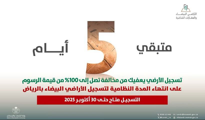 دعت منصة الأراضي البيضاء الملاك، اليوم السبت، إلى الإسراع بتسجيل أراضيهم في مدينة الرياض قبل انتهاء المهلة النظامية المحددة، والتي تبقى على انتهائها خمسة أيام فقط، محذّرة من أن التأخر في التسجيل قد يترتب عليه مخالفة تصل إلى 100% من قيمة الرسوم.
