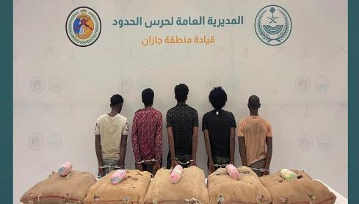 ألقت الدوريات البرية لحرس الحدود في قطاع الدائر، بمنطقة جازان، القبض على 5 مخالفين لنظام أمن الحدود من الجنسية الإثيوبية، لتهريبهم 100 كيلوجرام من نبات القات المخدر، وتم استكمال الإجراءات النظامية الأولية بحق المخالفين، وتسليمهم والمضبوطات لجهة الاختصاص.