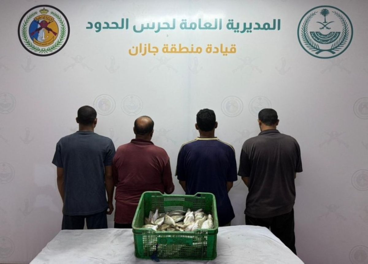 ضبطت الدوريات الساحلية لحرس الحدود في محافظة بيش بمنطقة جازان (4) مقيمين من الجنسية المصرية مخالفين للائحة الأمن والسلامة لمزاولي الأنشطة البحرية في المناطق البحرية للمملكة العربية السعودية، وذلك لممارستهم الصيد دون تصريح بمنطقة محظورة، وبحوزتهم أسماك مصادة، وتم اتخاذ الإجراءات النظامية بحقهم بالتنسيق مع الجهات المختصة.