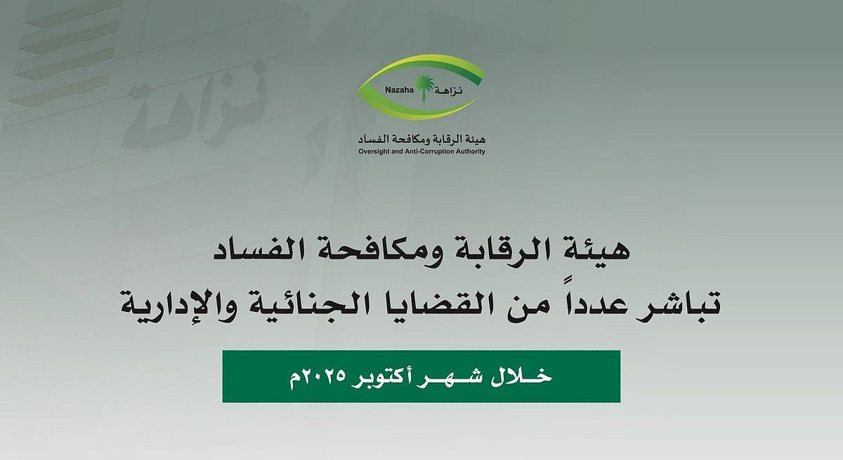 أعلنت هيئة الرقابة ومكافحة الفساد (نزاهة) مباشرتها عدداً من القضايا الجنائية والإدارية خلال شهر أكتوبر 2025، في إطار جهودها المستمرة لحماية المال العام ومكافحة الفساد بجميع أشكاله.