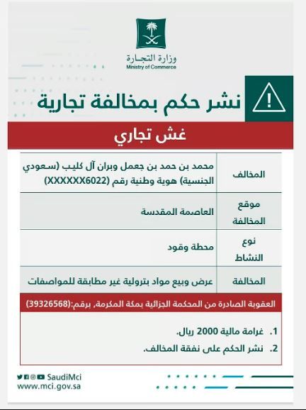ونشرت الوزارة الحكم القضائي النهائي الصادر من المحكمة الجزائية بمكة المكرمة المتضمن غرامة مالية 2000 ريال، ونشر الحكم على نفقة المخالف.