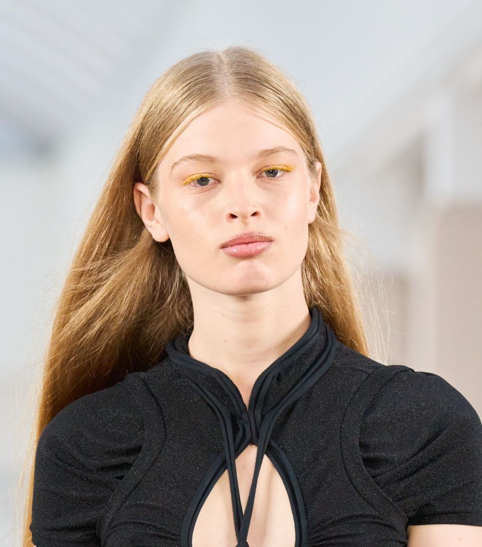 أما أوتولينجر Ottolinger فقد اختتم عروض باريس بلمسة فنية خارجة عن المألوف، حيث ظهرت العارضات برموش مصبوغة باللون الأصفر الجريء الذي منح العيون بعداً مستقبلياً مفعماً بالحيوية. اكتفى خبراء التجميل ببشرة طبيعية شفافة وشفاه نيود خفيفة لتبقى الرموش محور الإطلالة. هذه الصيحة الجريئة تُعد خياراً مثالياً لمحبات الابتكار وعاشقات الإطلالات غير التقليدية.