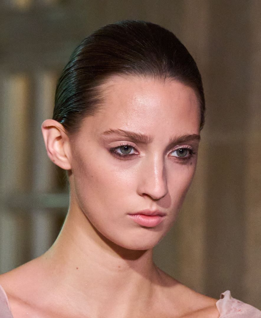 في عرض آن ديميليميستر Ann Demeulemeester، هيمنت نعومة البشرة المخملية المطفأة ذات النغمات الوردية الرقيقة. اعتمدت الدار على مكياج طبيعي المظهر يركز على توحيد اللون وتعزيز التوهج الداخلي للبشرة من دون أي لمعان. الوجنتان اكتسبتا لمسة وردية خفيفة، بينما الشفاه جاءت بلون نيود زهري مطفأ يعزز هدوء الإطلالة. النتيجة كانت مظهراً متوازناً بين النعومة والرقي العصري.