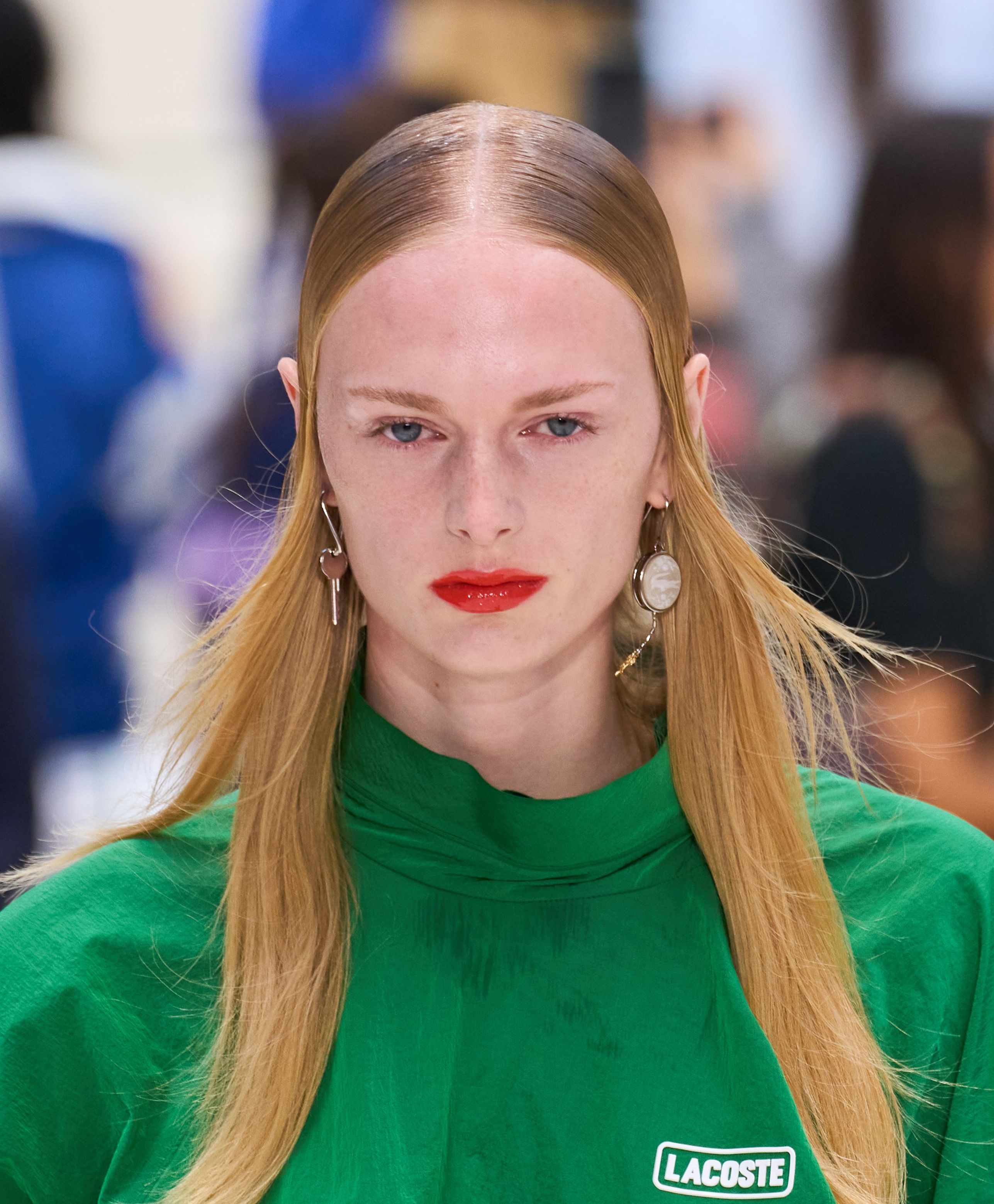 في عرض لاكوست Lacoste، عادت الكلاسيكية بلمسة عصرية من خلال أحمر الشفاه الأحمر الفاتح بلمعة غلوسية أنيقة. منح هذا اللون الشفاه حجماً جذاباً ولمعاناً يعكس الضوء بطريقة آسرة، بينما جاءت البشرة نقية ومات لتوازن اللمعة الجريئة. تسريحة الشعر المنسدلة البسيطة أضافت طابعاً رياضياً أنيقاً يتناغم مع أسلوب العلامة المعروف بالبساطة الفاخرة.