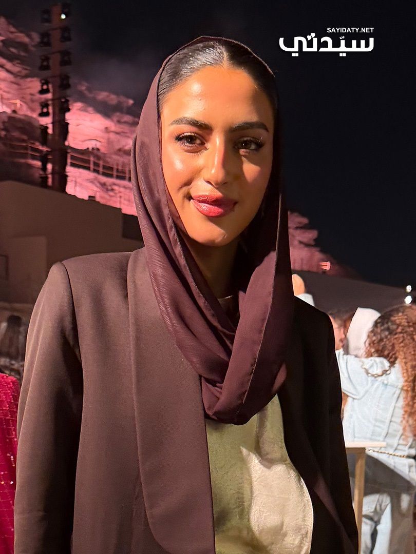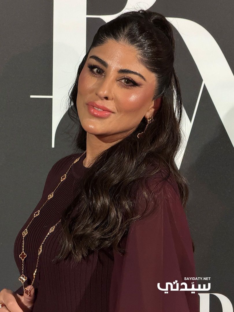 كما ظهرت الممثلة روان الطويرقي بإطلالة لافتة بمكياج سموكي بني مع سحبة عيون عريضة ورموش كثيفة تبرز نظراتها بعمق وجاذبية، اختارت أحمر شفاه نيود لامعاً يمنح الإطلالة توازناً ناعماً، أما شعرها فجاء بفرق وسطي مع خصلتين جانبيتين، بينما رفع الجزء العلوي على شكل بومبيه أنيق مع انسدال باقي الشعر على الظهر.