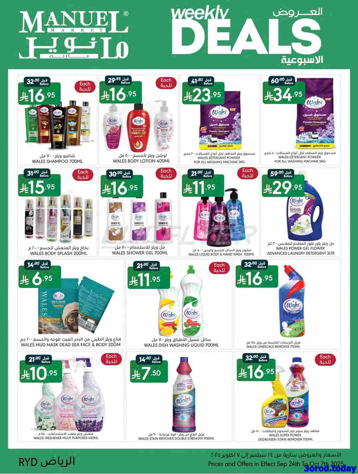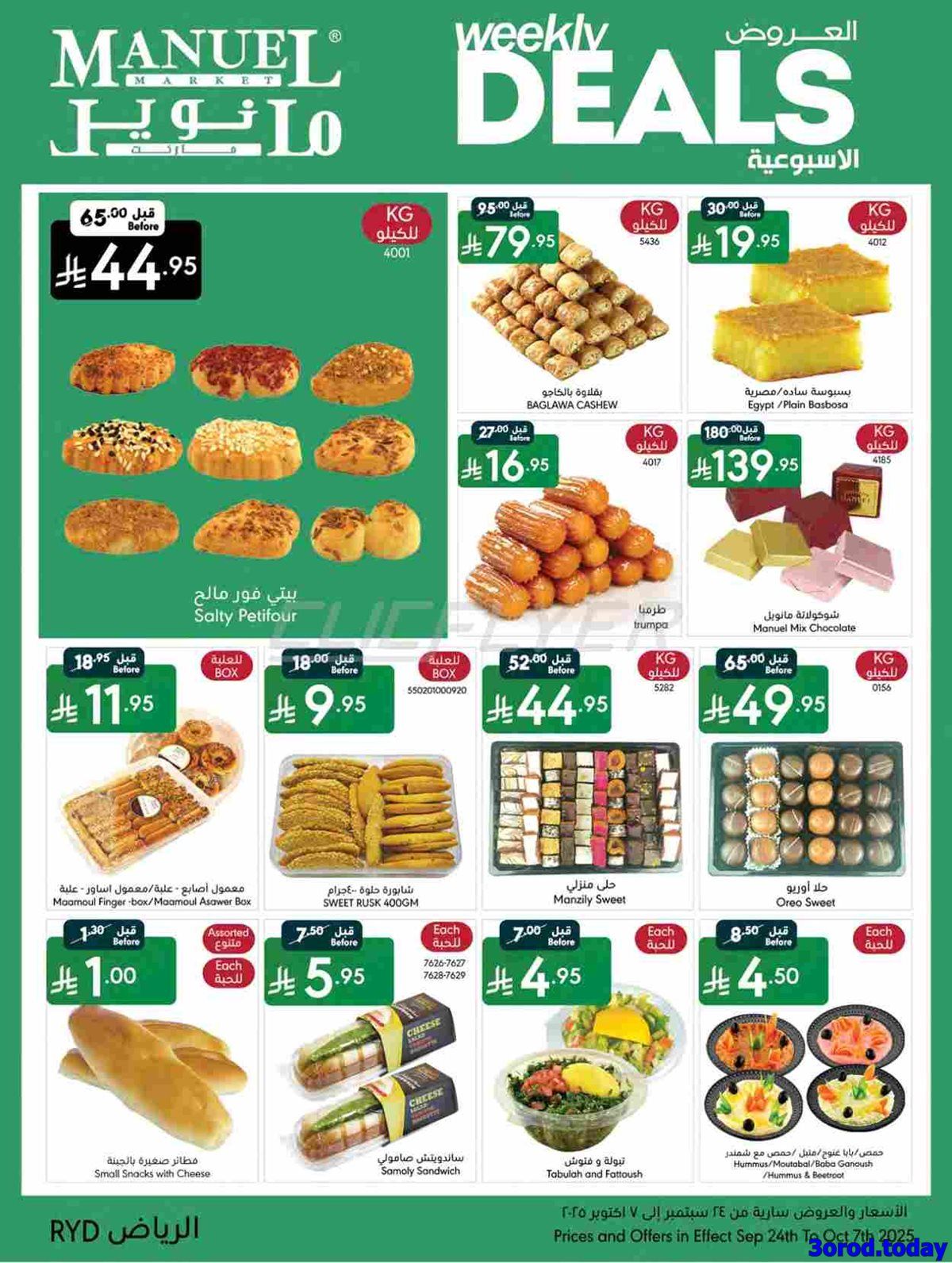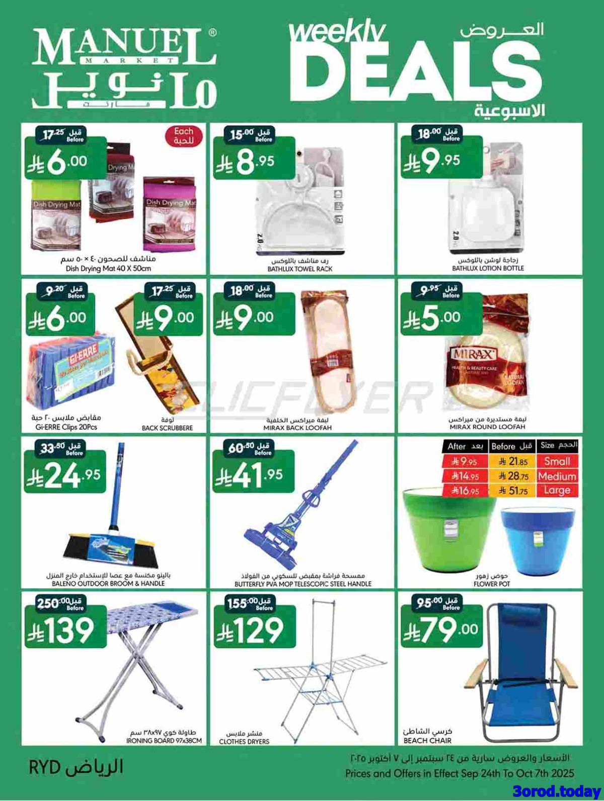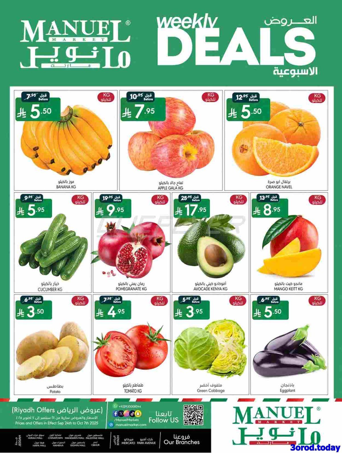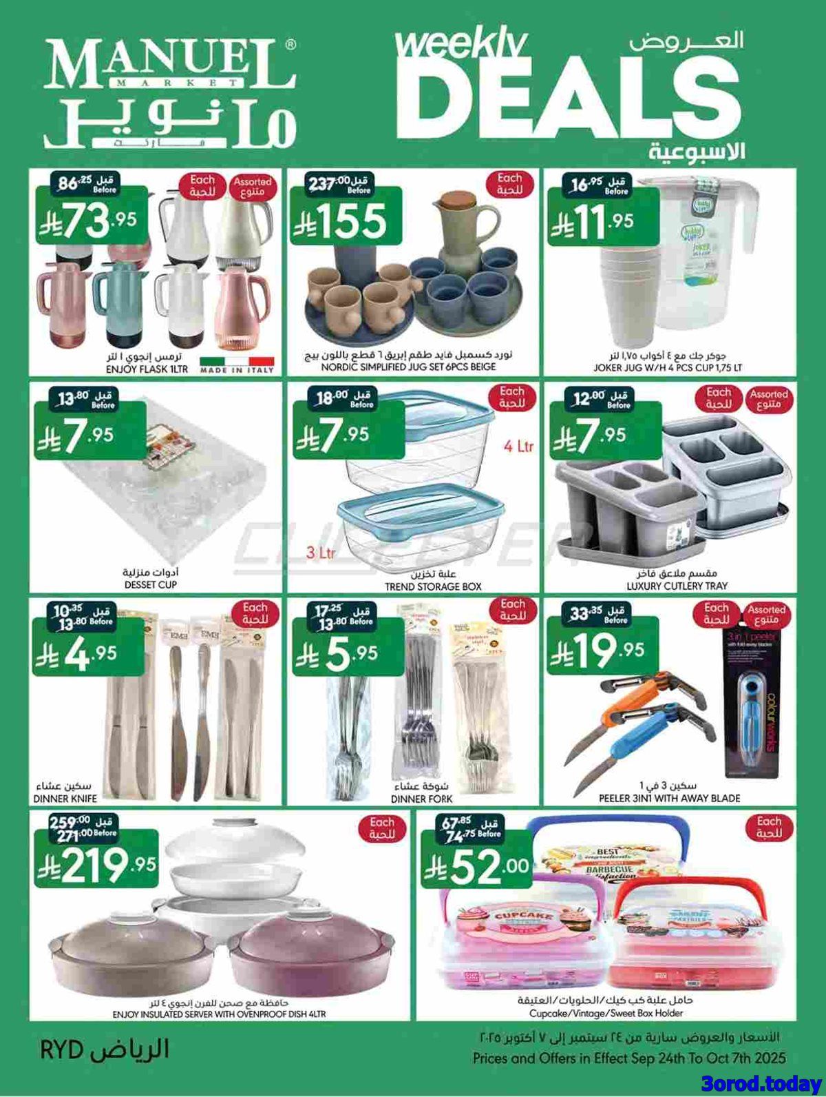 عروض مانويل الرياض الأسبوعية الأربعاء 24-9-2025 تقدم خصومات على لحوم الغنم المبردة والدواجن الكاملة والأسماك الطازجة بجانب المخبوزات الطازجة والخضروات كالخس والبروكلي والطماطم الكرزية والفواكه كما تشمل أجهزة المراوح الكهربائية وأجهزة تحضير العصائر وأطقم الطهي غير اللاصقة وأجهزة القهوة الأوتوماتيكية