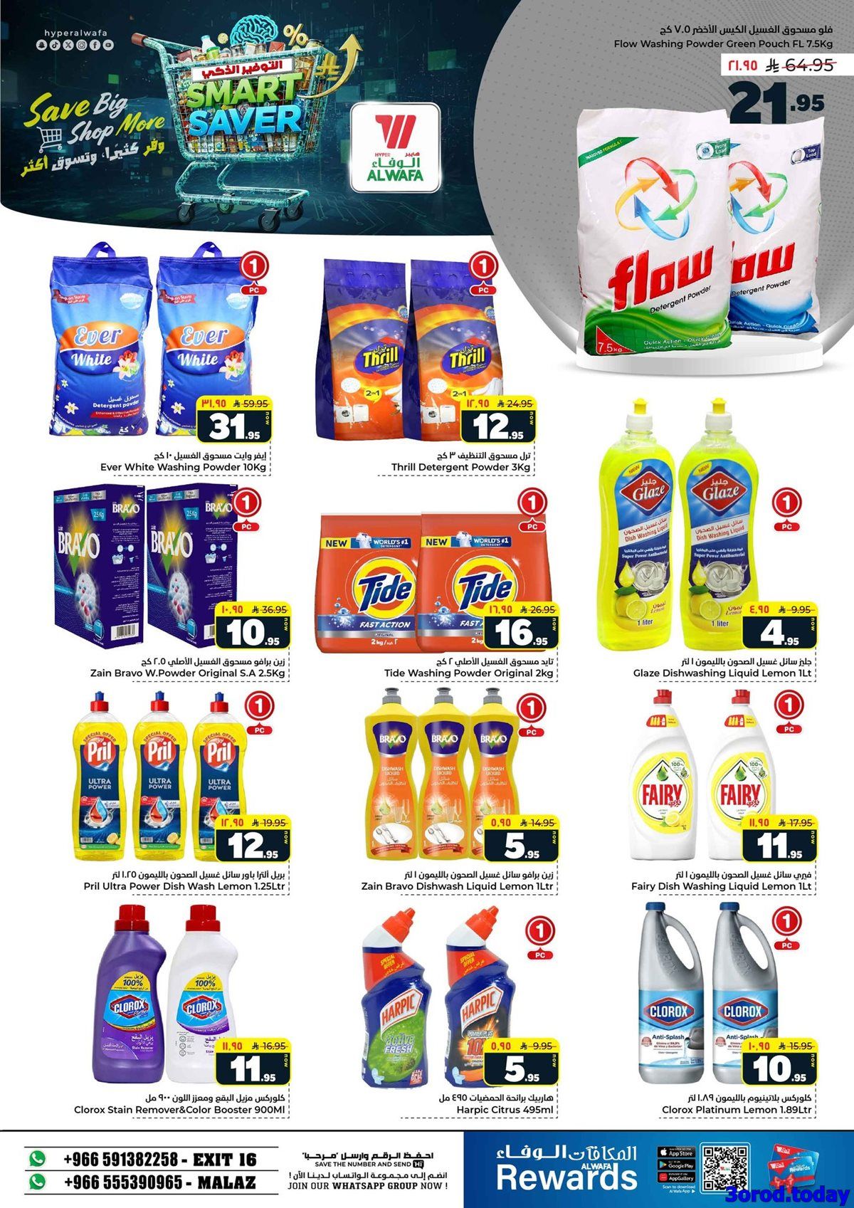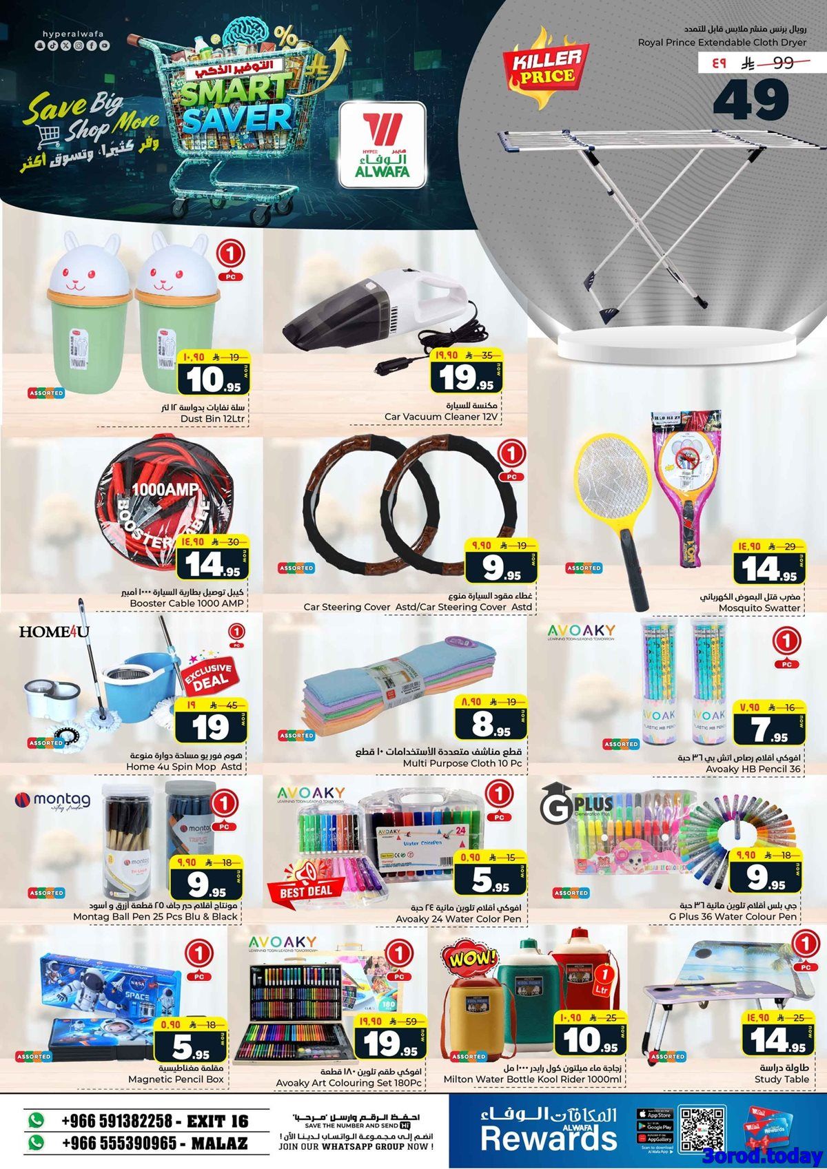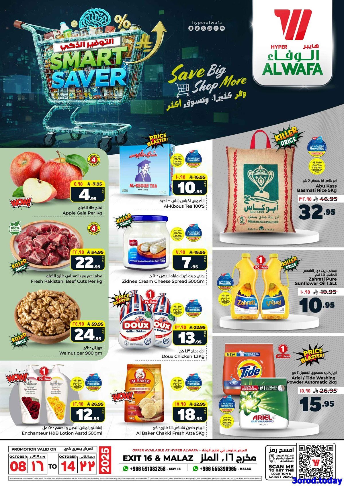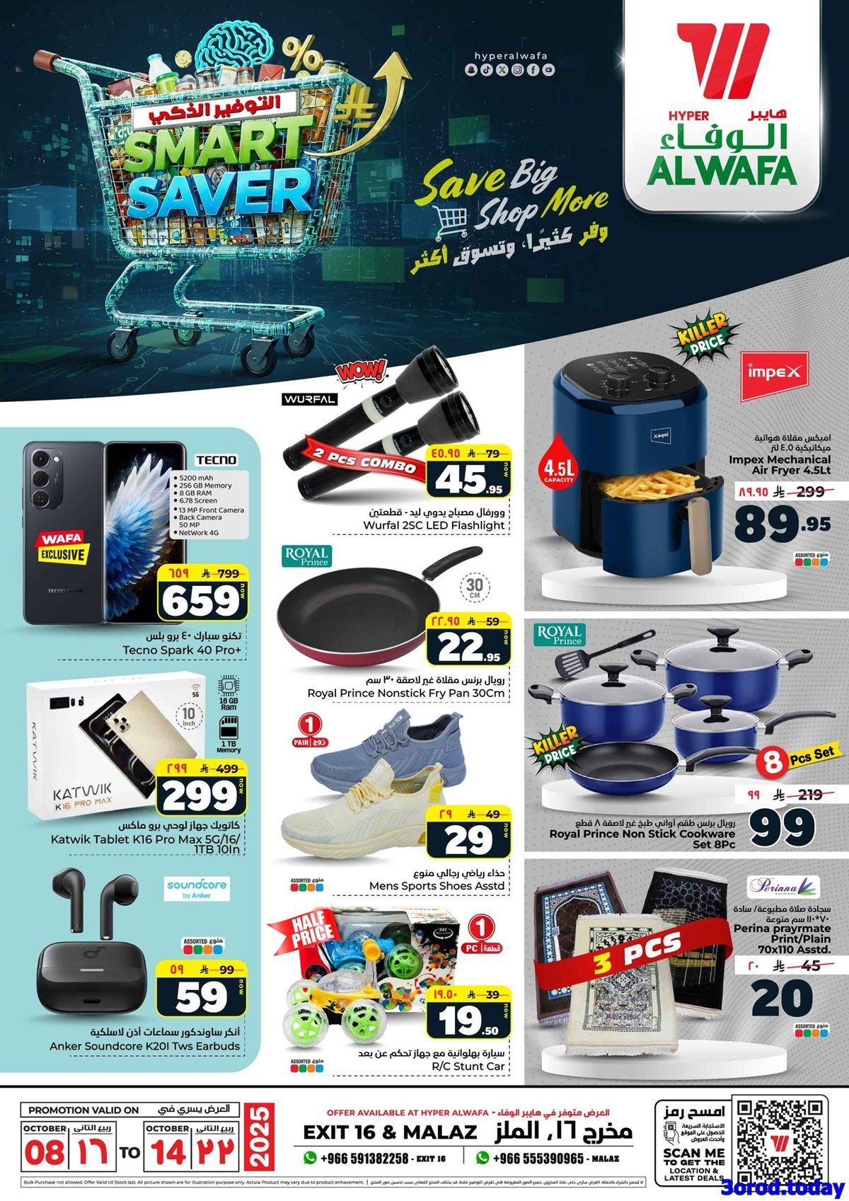 عروض الوفاء هايبر ماركت الأسبوعية الأربعاء 8/10/2025 تشمل المكانس الكهربائية وأجهزة المايكروويف وأطقم المطبخ الراقية ثم تقدم خصومات على اللحوم والدواجن ومنتجات البحر المجمدة بجانب عروض على الزيوت والصلصات والمعلبات كما تشمل التخفيضات أدوات المائدة وأجهزة القهوة وأفران الكعك الصغيرة