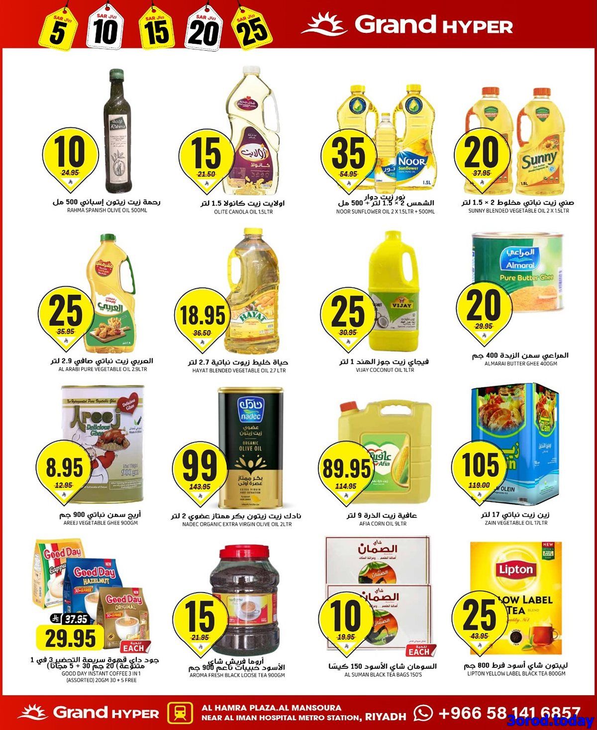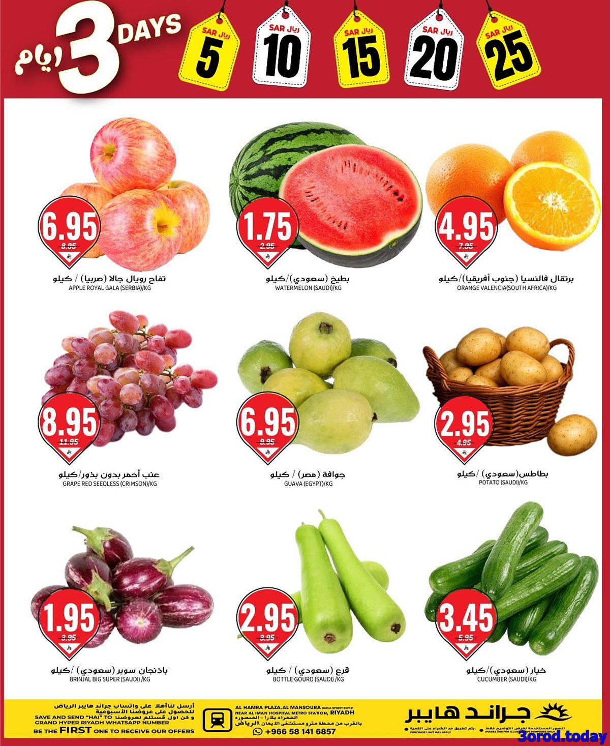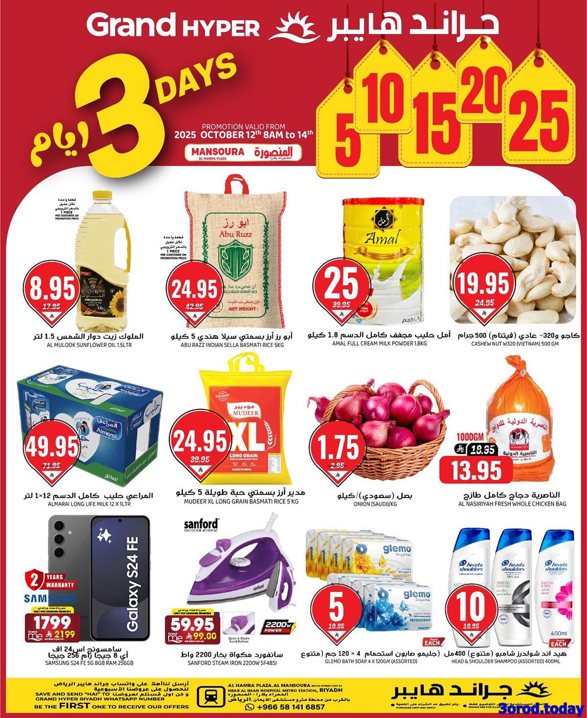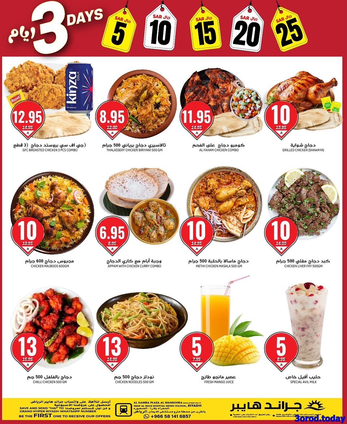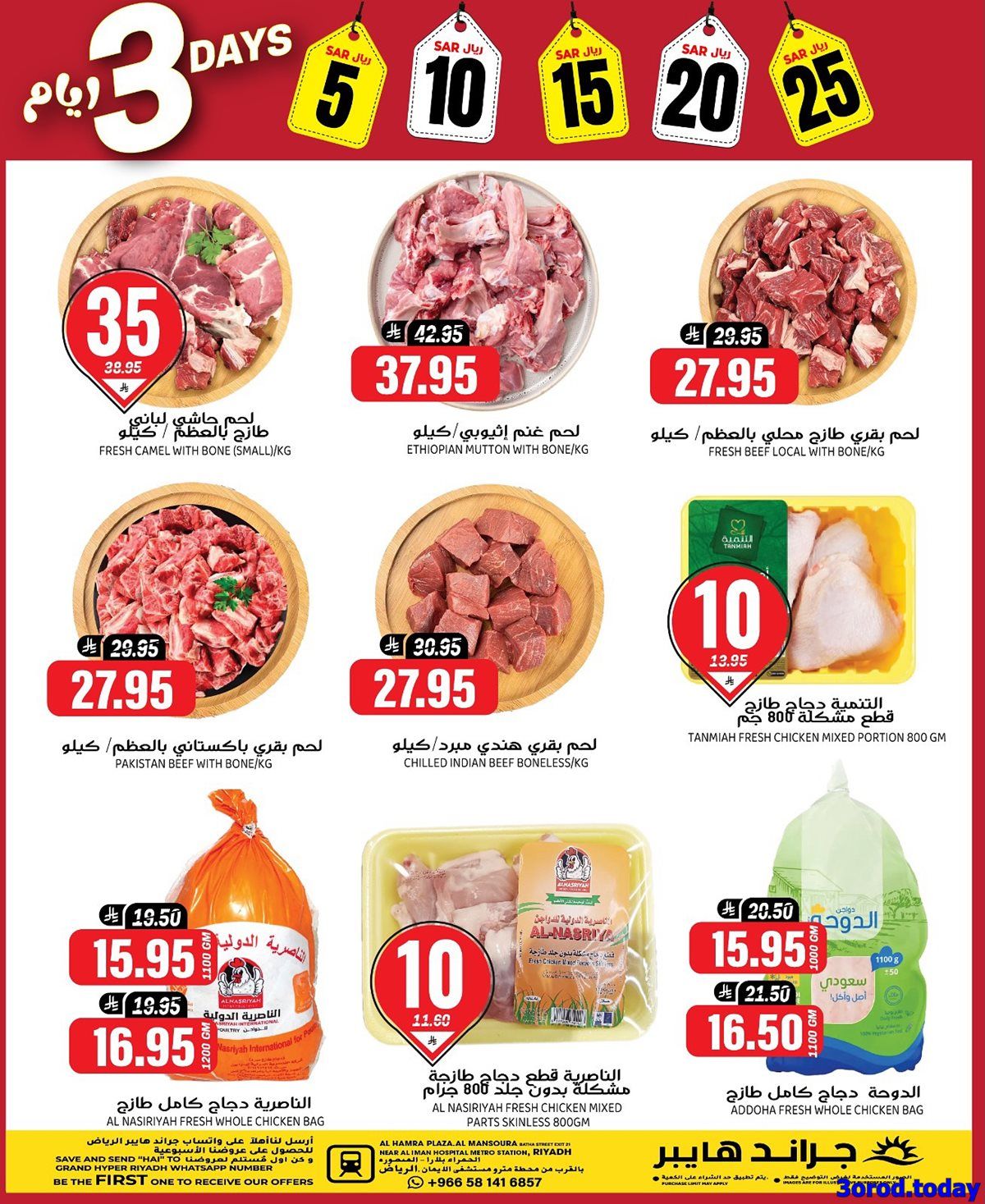 عروض جراند هايبر الرياض 12 أكتوبر 2025 تقدم تشكيلة واسعة من اللحوم الطازجة والدواجن والخضروات والفواكه حيث تتوفر لحوم الإبل الطازجة ولحم الغنم الإثيوبي والبقري الباكستاني والهندي و تشمل أيضا تشكيلة من المنتجات الاستهلاكية مثل الحليب طويل الأجل ومساحيق الغسيل إلى جانب عروض مميزة على الأرز البسمتي