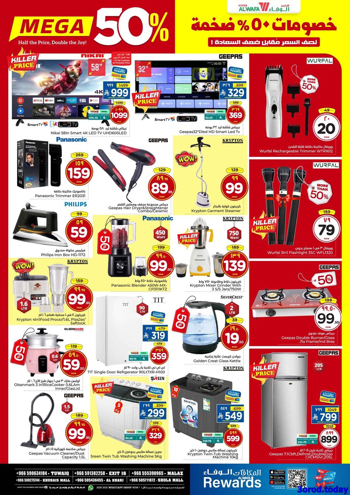 عروض الوفاء هايبر ماركت الأربعاء 23 ربيع الثاني 1447هـ و تشمل مجموعة كبيرة من المنتجات الغذائية المتنوعة منها جبن الموزاريلا وجبن المثلثات بالإضافة إلى أنواع مختلفة من الخبز والدجاج المجمد والبقوليات والخضروات الطازجة مثل البازلاء والجزر والباذنجان بجانب المنتجات المجمدة مثل السمك والبرغر وكذلك المكرونة والأرز الفاخر