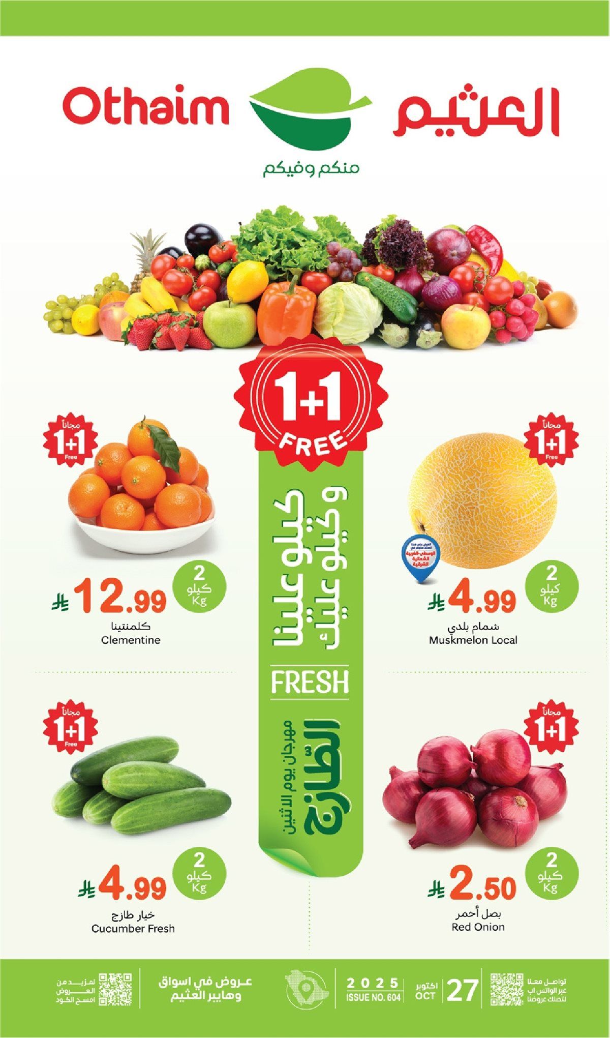 بنقدملكم احدث عروض العثيم الطازج بتاريخ الاثنين 5 جماد الاول 1447هـ و بتوفر تشكيلة من الخضروات والفواكه الطازجة وتشمل أيضا منتجات الأجبان بأنواع متعددة بالإضافة إلى أصناف المقبلات و بتركز علي اللحوم الطازجة مثل اللحم البقري المفروم الطازج ولحم الماعز البربري وغيرها مع احدث اجهزة المطبخ مع عرض حصري 1+1 مجانا