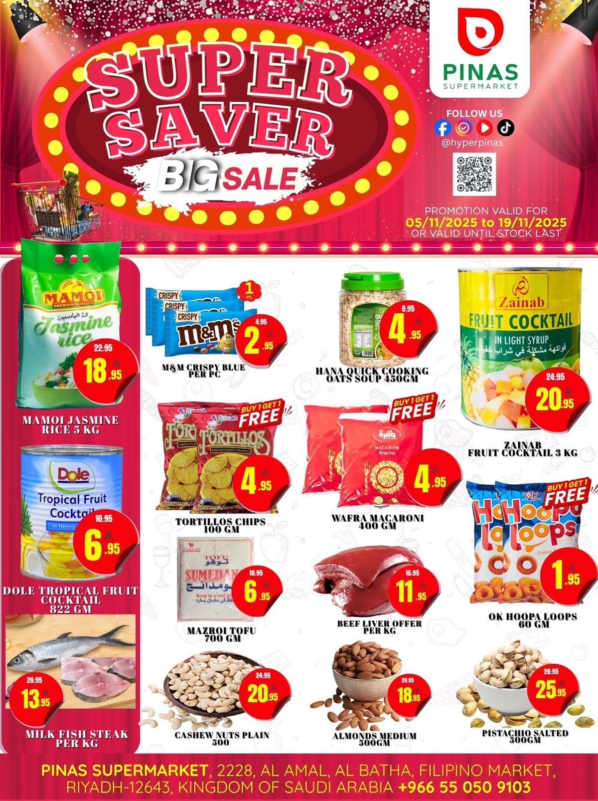 عروض بيناس هايبر ماركت الرياض الأسبوعية الأربعاء 5 نوفمبر 2025 تحتوي على منتجات غذائية تشمل اللحوم الطازجة والدواجن والفواكه والخضروات والعسل الطبيعي والمخبوزات والجبن والألبان والعصائر الطازجة بالإضافة إلى تخفيضات على الأجهزة المنزلية مثل أفران البيتزا وأجهزة الطهي الذكية ومكائن العجن وغيرها باقل الاسعار
