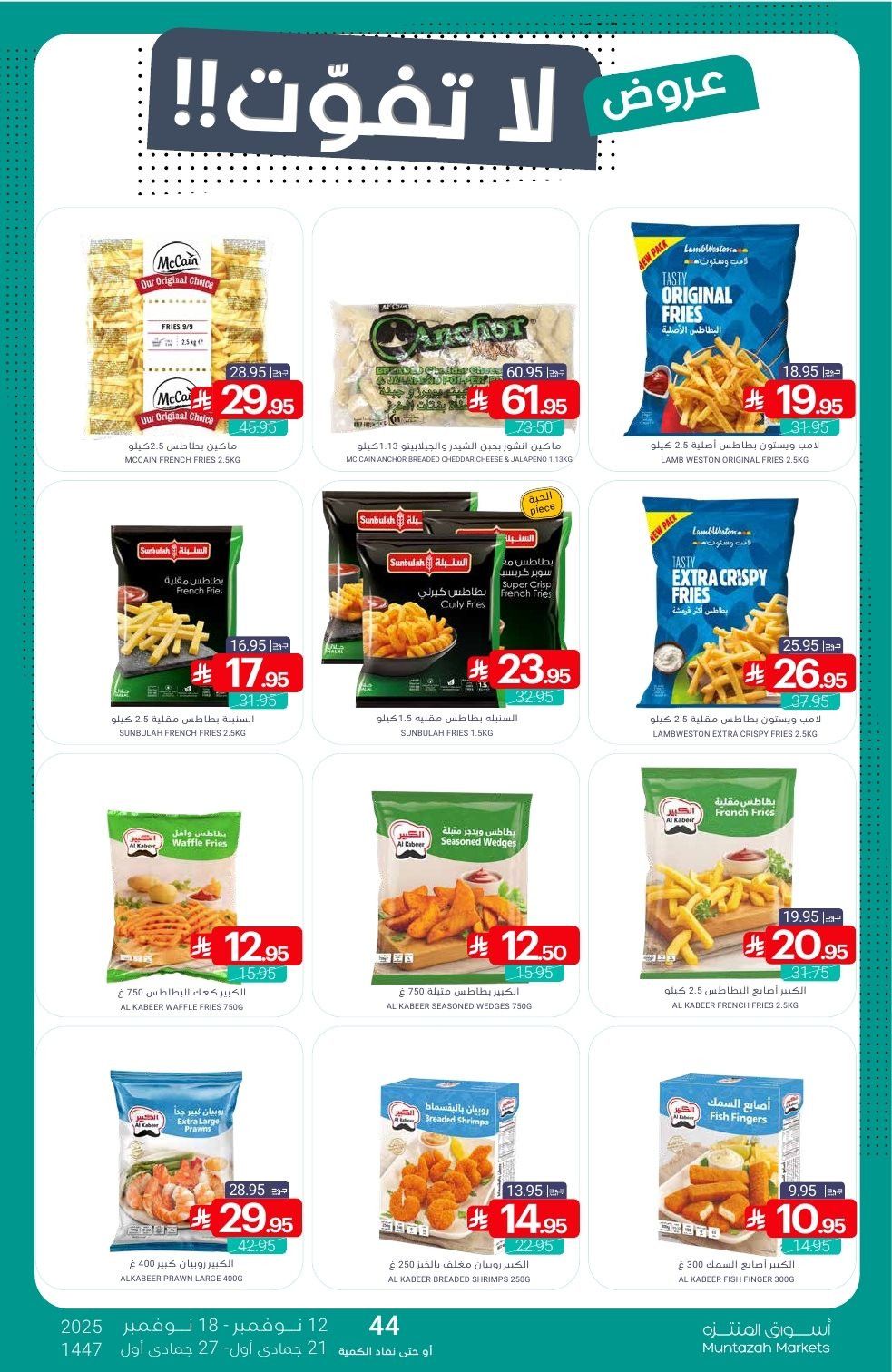 عروض أسواق المنتزه الأربعاء 21 جماد الاول 1447هـ تقدم تخفيضات على الأجبان والفواكه الموسمية والزيوت النباتية والعسل الطبيعي والفواكه المجففة والمعلبات والحبوب والأرز والدقيق و بتوفر كمان الأجهزة المنزلية التي تضم أفران الطبخ وأجهزة العجن وأفران الخبز ومكائن القهوة ومضارب الخلط باقل الاسعار .