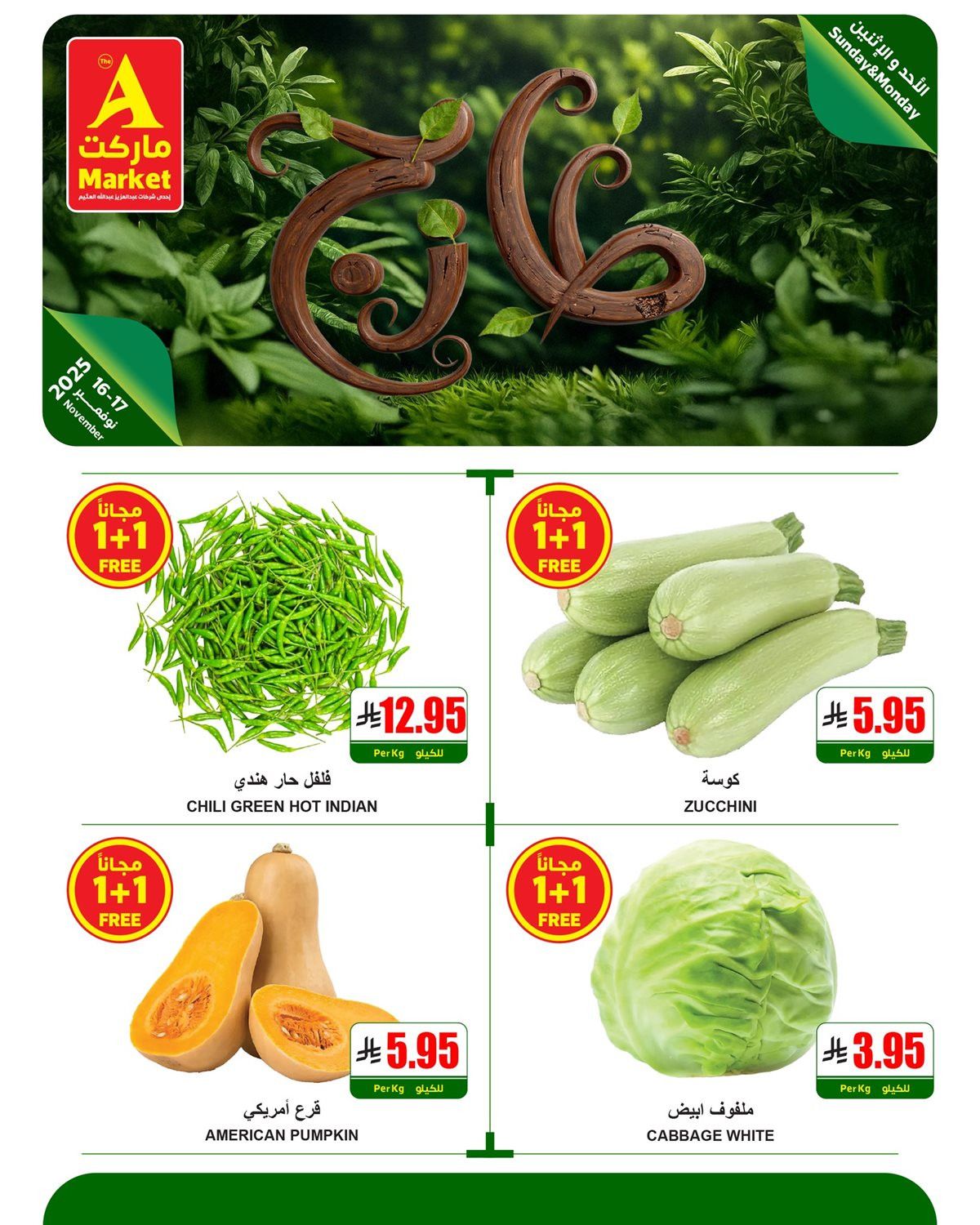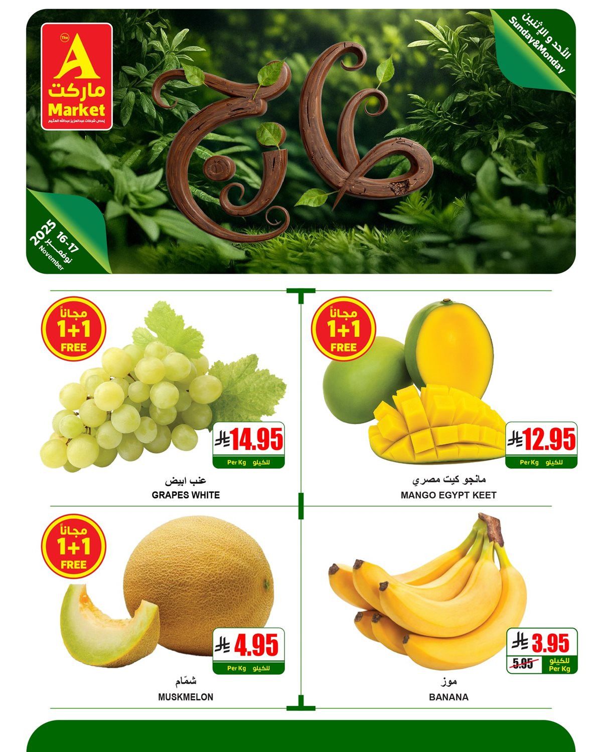 نستعرض معاكم اليوم عروض ايه ماركت الرياض بتاريخ الاحد 25 جماد الاول 1447هـ و بتشمل علي العنب الأبيض والمانجو المصري والموز والبطيخ والمنتجات الطازجة من الخضار كالكوسة والملفوف والفلفل الحار والقرع و بتوفر كمان منتجات الأجبان ومشتقات الحليب المختلفة مثل القشطة والجبن الرومي بالإضافة إلى المخبوزات