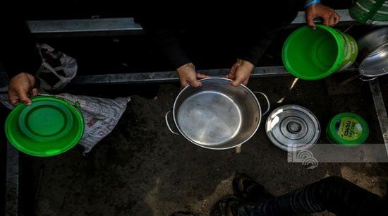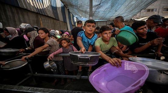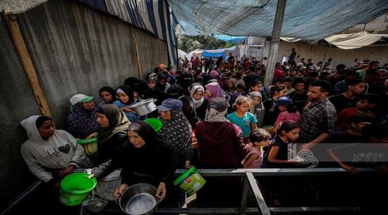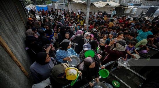 تجمع آلاف النازحين في مخيم النصيرات وسط قطاع غزة، حاملين أوانيهم الفارغة بحثاً عن لقمة تسد جوعهم، وسط ظروف إنسانية قاسية يفرضها الحصار المفروض على القطاع منذ أكثر من عامين.